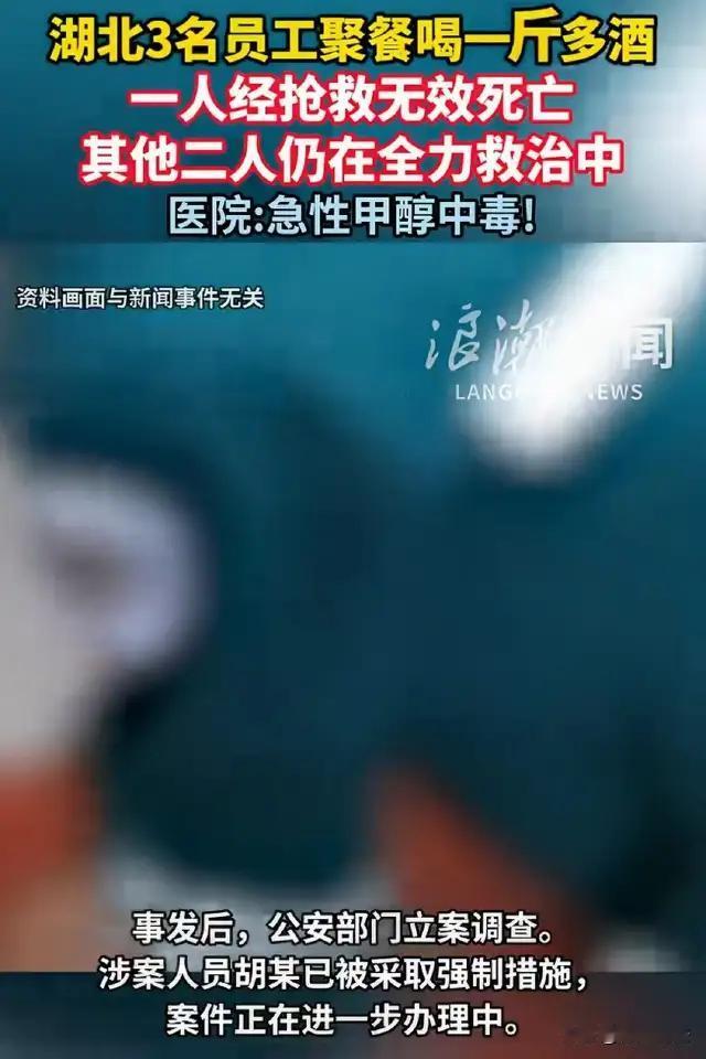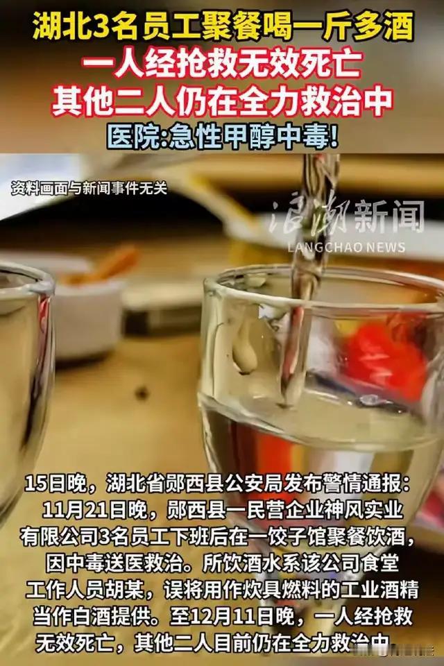 湖北十堰惊现夺命聚餐!5名男子下班从公司食堂打包1斤多白酒,到饺子馆小聚,谁料这一口下肚竟成生死劫:1人中毒身亡,1人脑死亡,1人危重抢救,悲剧根源让人脊背发凉——食堂员工粗心大意,竟把工业酒精当白酒给了他们! 本是寻常工友小聚,盼的是卸下疲惫,谁知一杯“毒酒”酿出天人永隔。工业酒精含剧毒甲醇,摄入少量便会致盲、脏器衰竭,误食堪比夺命,食堂这般粗心,岂是一句疏忽能搪塞? 工友的生命戛然而止,破碎的家庭欲哭无泪,网友怒批:食堂食材管控形同虚设,人命关天的事竟如此儿戏!食品安全无小事,每一次疏忽都可能是致命隐患,愿逝者安息,伤者脱险,更盼严查追责,给受害者家庭一个沉甸甸的交代!聚餐猝死 聚餐上饮酒