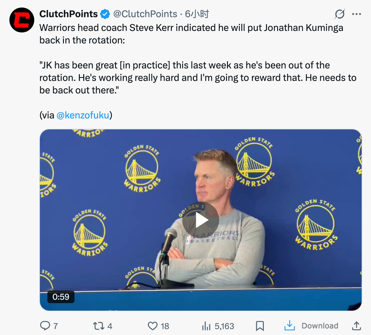 科尔表示,他会让库明加重新回到轮换阵容中:“在最近这一周没进入轮换的情况下,JK(库明加)在训练中的表现非常出色。他训练得非常刻苦,我会为此给予回报。他需要重新回到场上。”