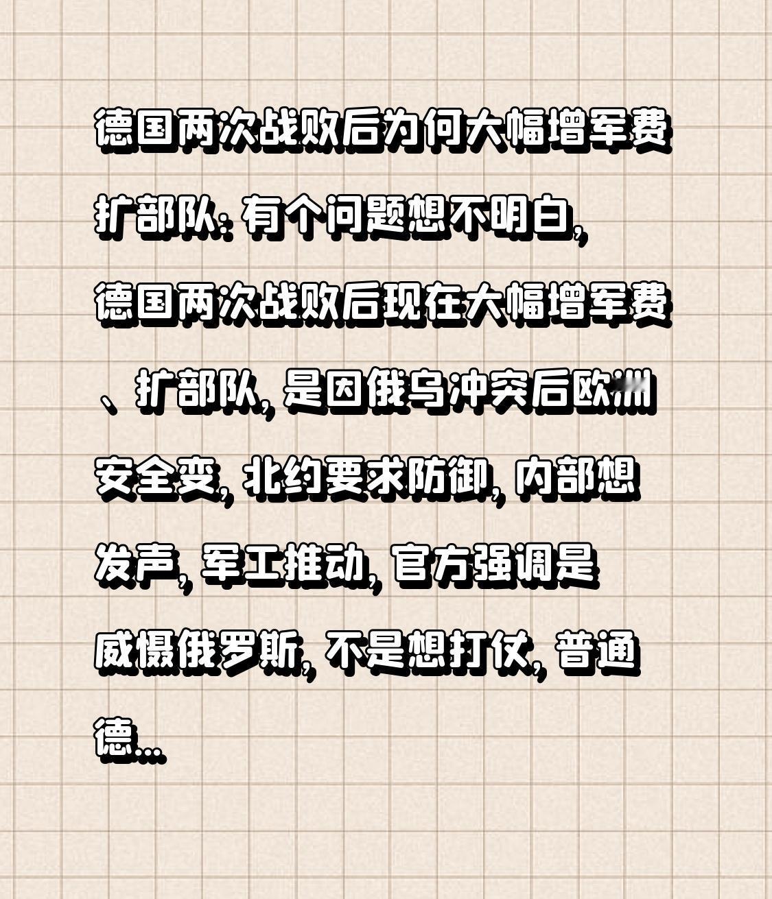 德国两次战败后为何大幅增军费扩部队:有个问题想不明白,德国两次战败后现在大幅增军费、扩部队,是因俄乌冲突后欧洲安全变,北约要求防御,内部想发声,军工推动,官方强调是威慑俄罗斯,不是想打仗,普通德国人不愿参战,是迫于形势。