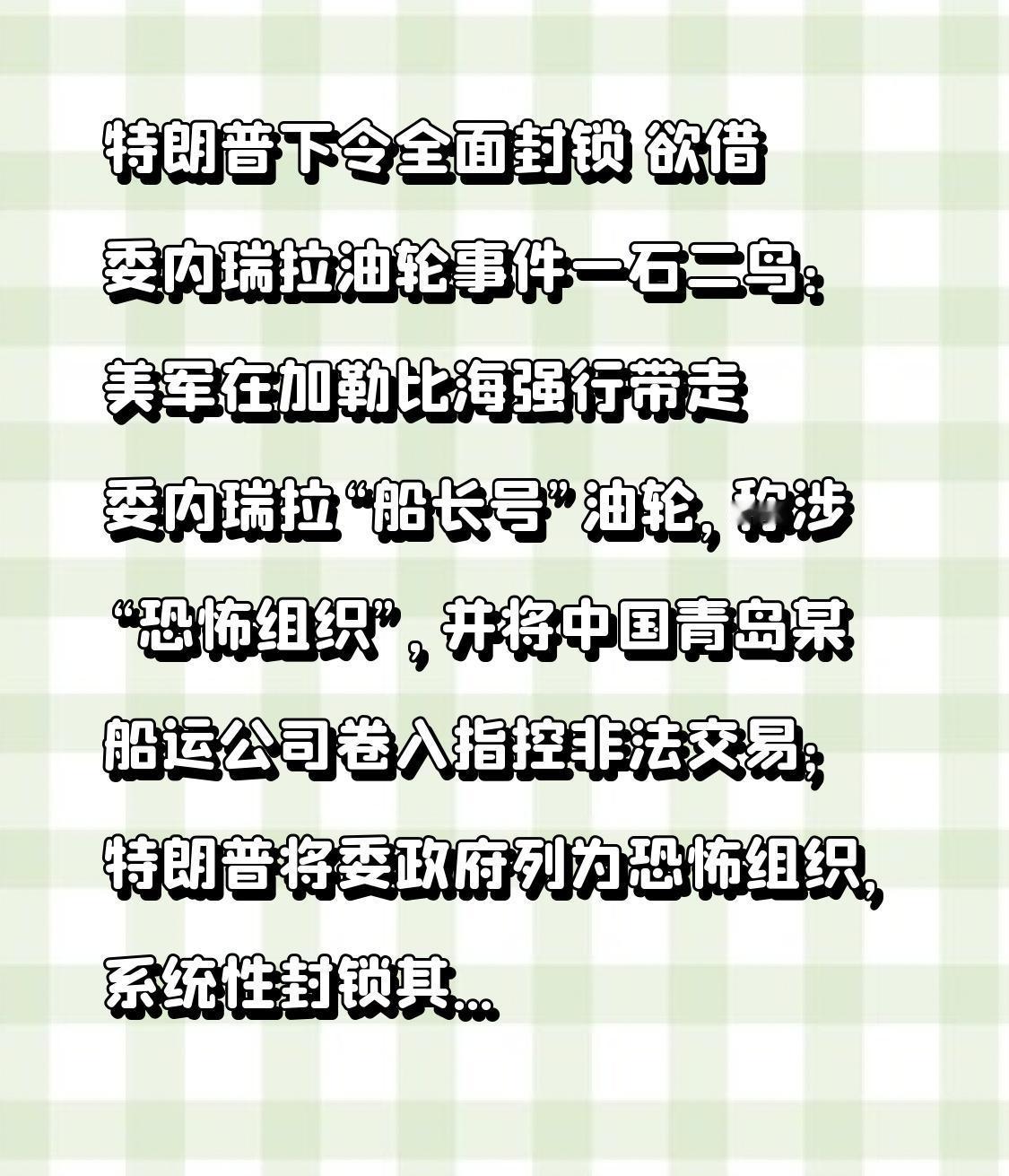 特朗普下令全面封锁 欲借委内瑞拉油轮事件一石二鸟:美军在加勒比海强行带走委内瑞拉“船长号”油轮,称涉“恐怖组织”,并将中国青岛某船运公司卷入指控非法交易;特朗普将委政府列为恐怖组织,系统性封锁其石油出口,冲击中委正常能源合作;中国反对滥施制裁,强调合作合法,美国借“反恐”行霸权经济战。
