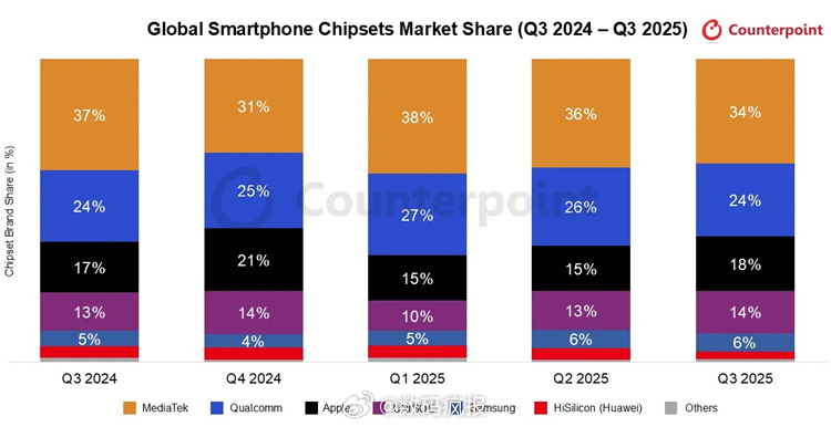 从2024年第三季度到2025年第三季度,全球智能手机处理器份额排名,联发科天玑持续排名第一位,其次是高通骁龙联发科,高通,苹果,智能手机处理器三巨头,短时间内没有品牌能撼动这三家的地位