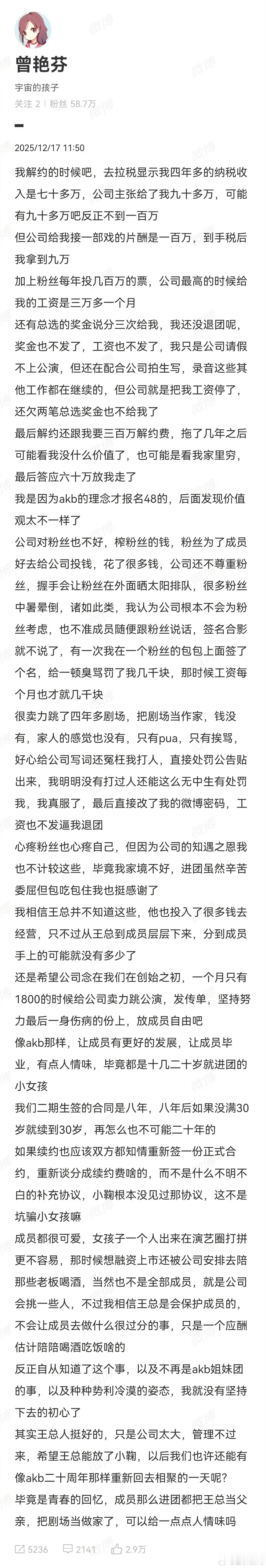 【曾艳芬说鞠婧祎没见过补充协议】 SNH48前成员亲述因陪酒退团近日, 与的官司激战正酣。12月17日,同期的SNH48前成员发声,称鞠婧祎并未见过丝芭提及的补充协议:“我们二期生签的合同是八年,八年后如果没满30岁就续到30岁,再怎么也不可能二十年的。如果续约也应该双方都知情重新签一份正式合约,重新谈分成续约费啥的,而不是什么不明不白的补充协议,小鞠根本没见过那协议,这不是坑骗小女孩嘛。”