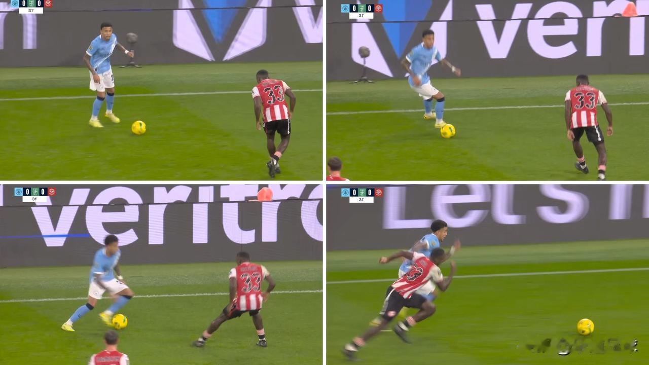 在英超联赛曼城对阵布伦特福德(客场)的比赛中,萨维尼奥担任左翼锋首发对阵凯约德,过人尝试5次均未成功。 而在联赛杯比赛中,他完成了7次过人(成功率58.3%)。 下图是他对阵凯约德的一次典型突破:先用右脚内侧触球内切,左脚再轻拨变向,趁凯约德重心固定的瞬间突然加速下底。随后他凭借速度完成超车,将球传向禁区。 整个过程始终与凯约德保持距离,避免对方利用手臂进行贴身干扰。