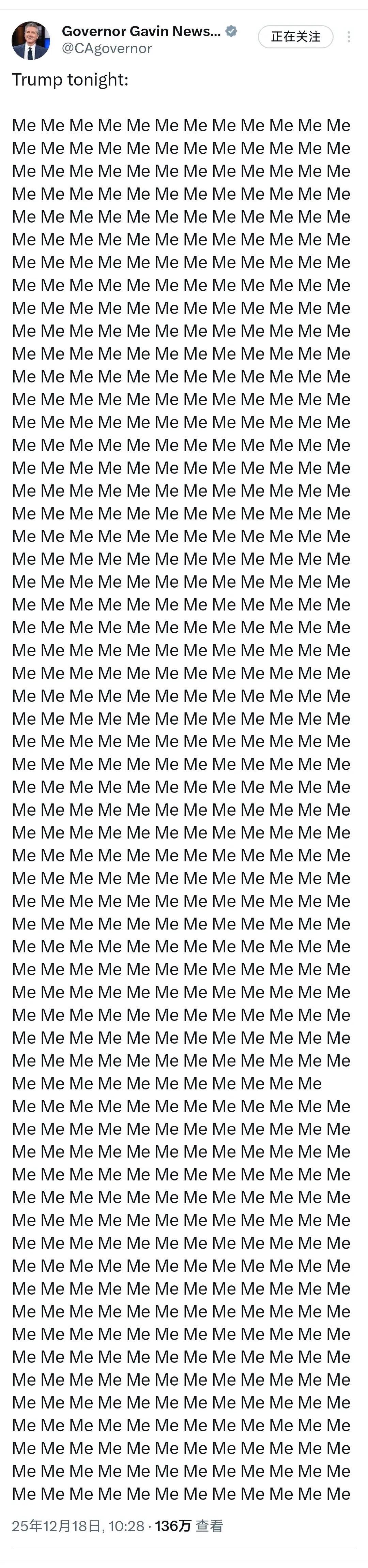 18日,特朗普发表20分钟全国讲话,除了大吹特吹之外,特朗普对自己执政这一年的成绩自我评价A++++! 但随即,加州州长纽森发文嘲讽:“特朗普今晚:我、我、我……”(这段文本中“我 Me”的数量是 200个。) 不得不承认,纽森的嘲讽十分犀利。特朗普讲话时的自我陶醉,频繁提及“我”,把全国讲话变成了个人“自夸秀”。其自夸的所谓A++++的执政成绩背后,无非是特朗普式“赢学”的又一次展示!