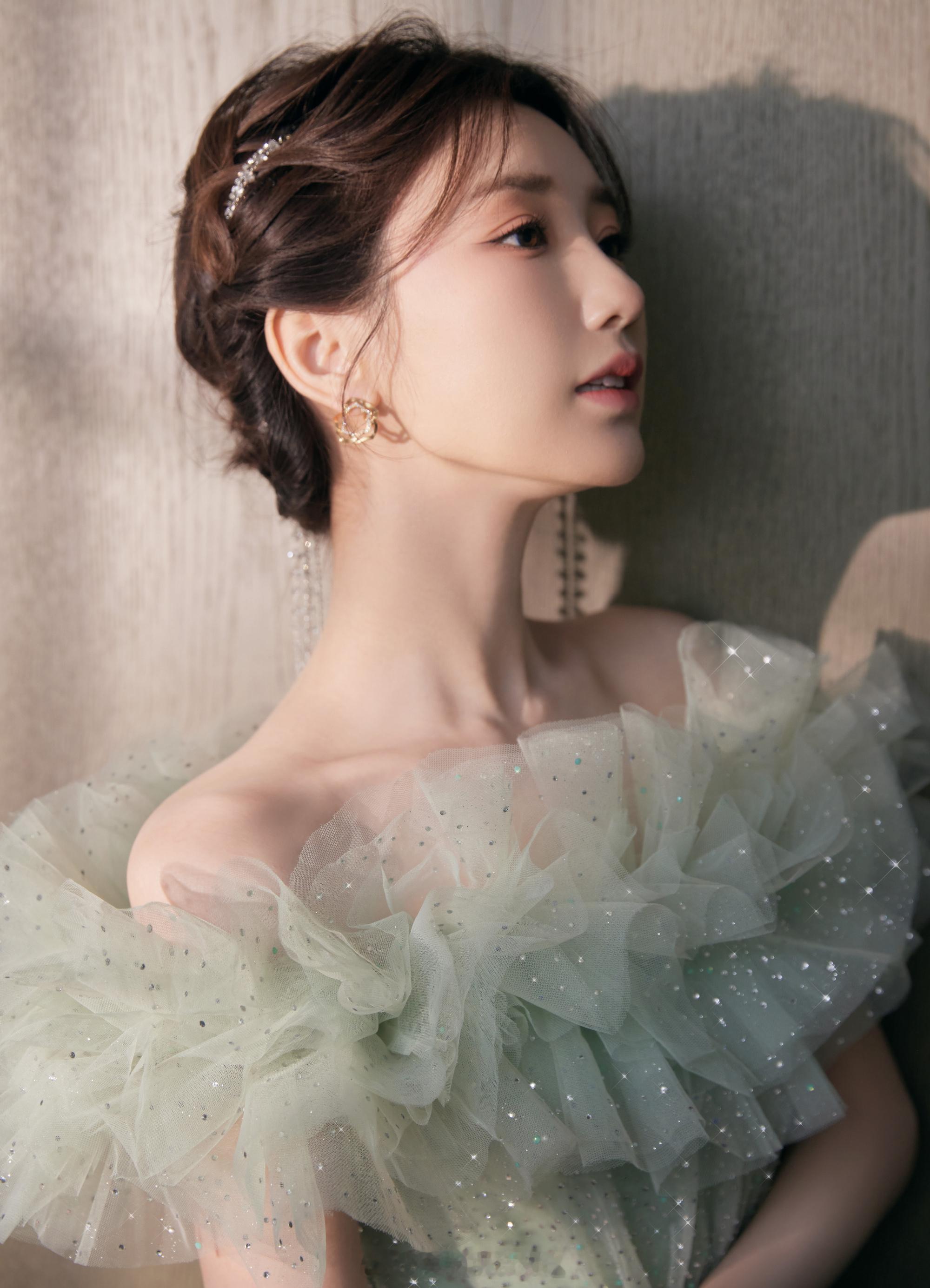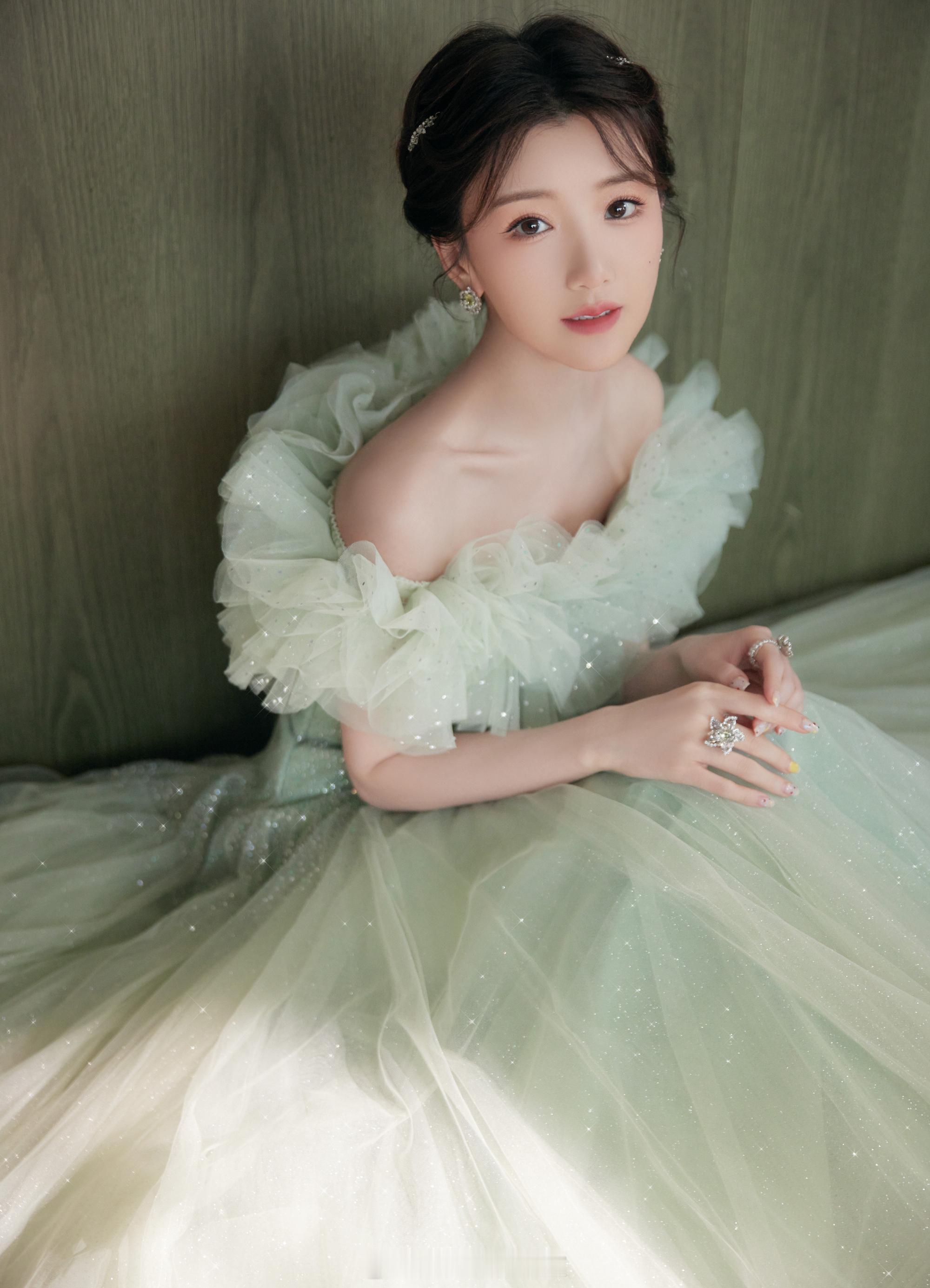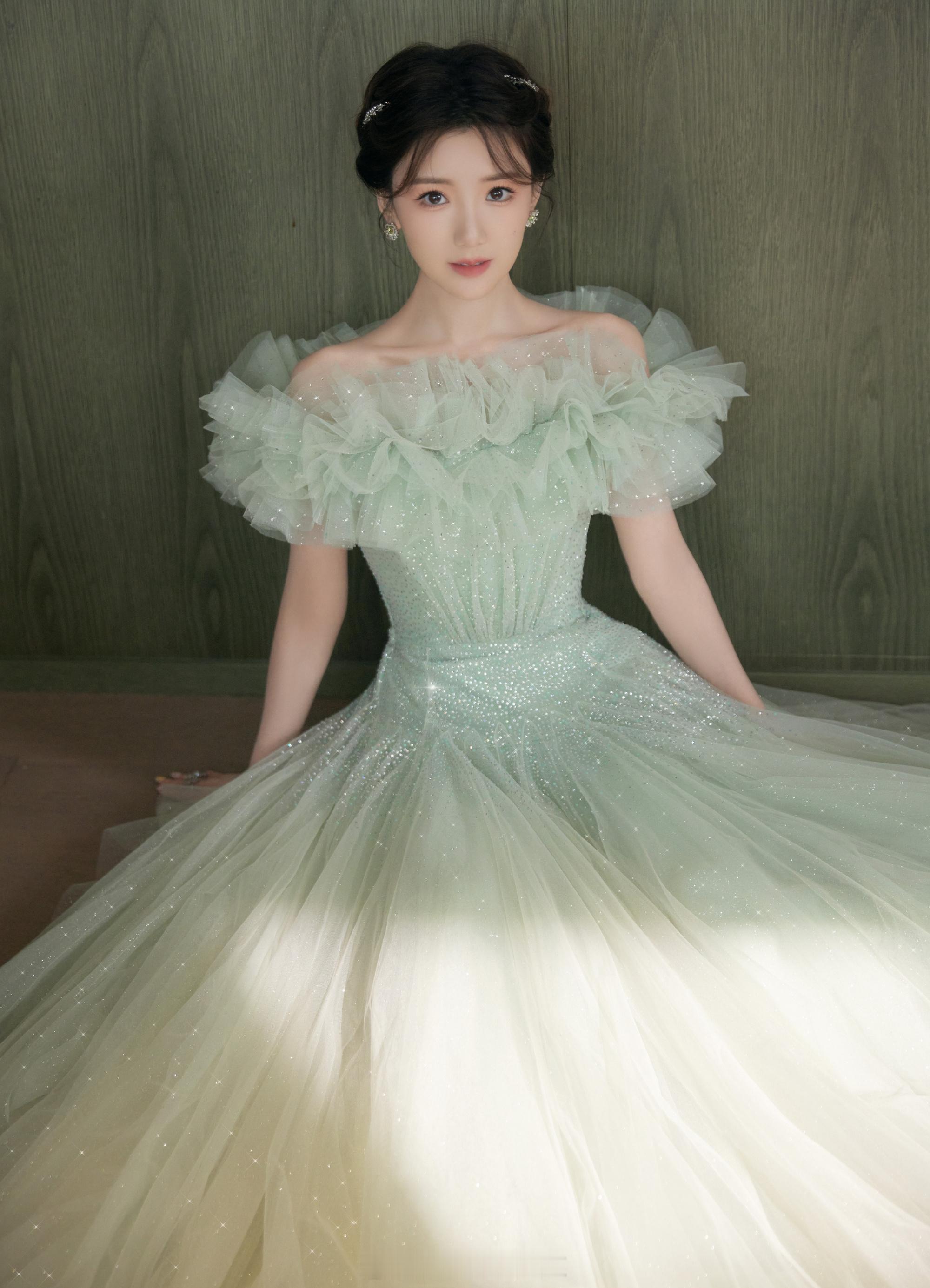 毛晓彤绿色碎钻星河纱裙清雅灵动