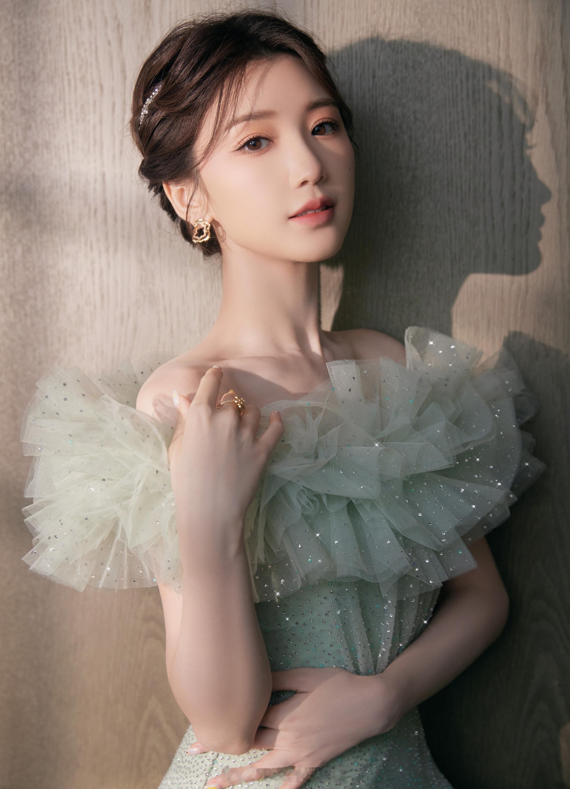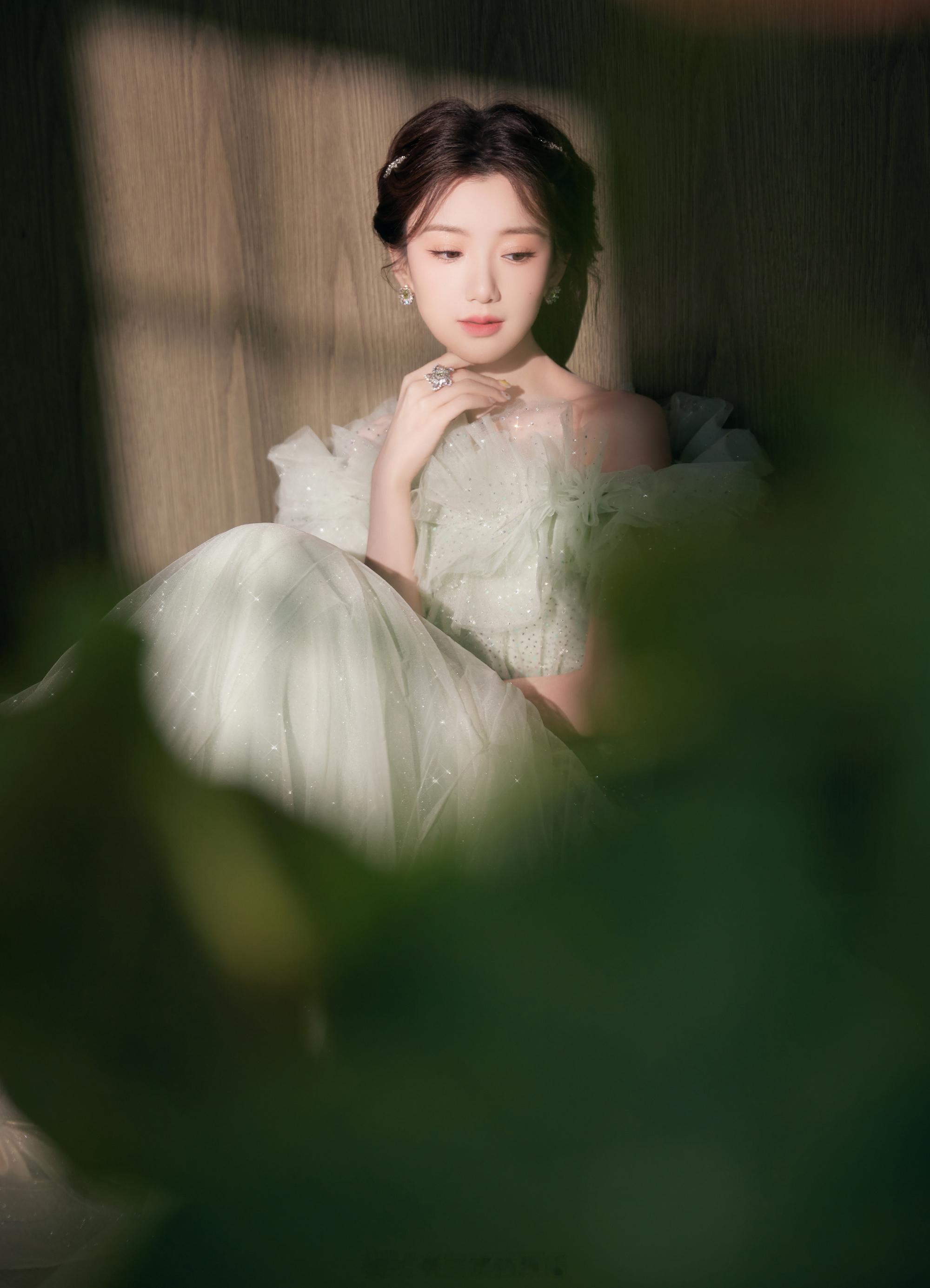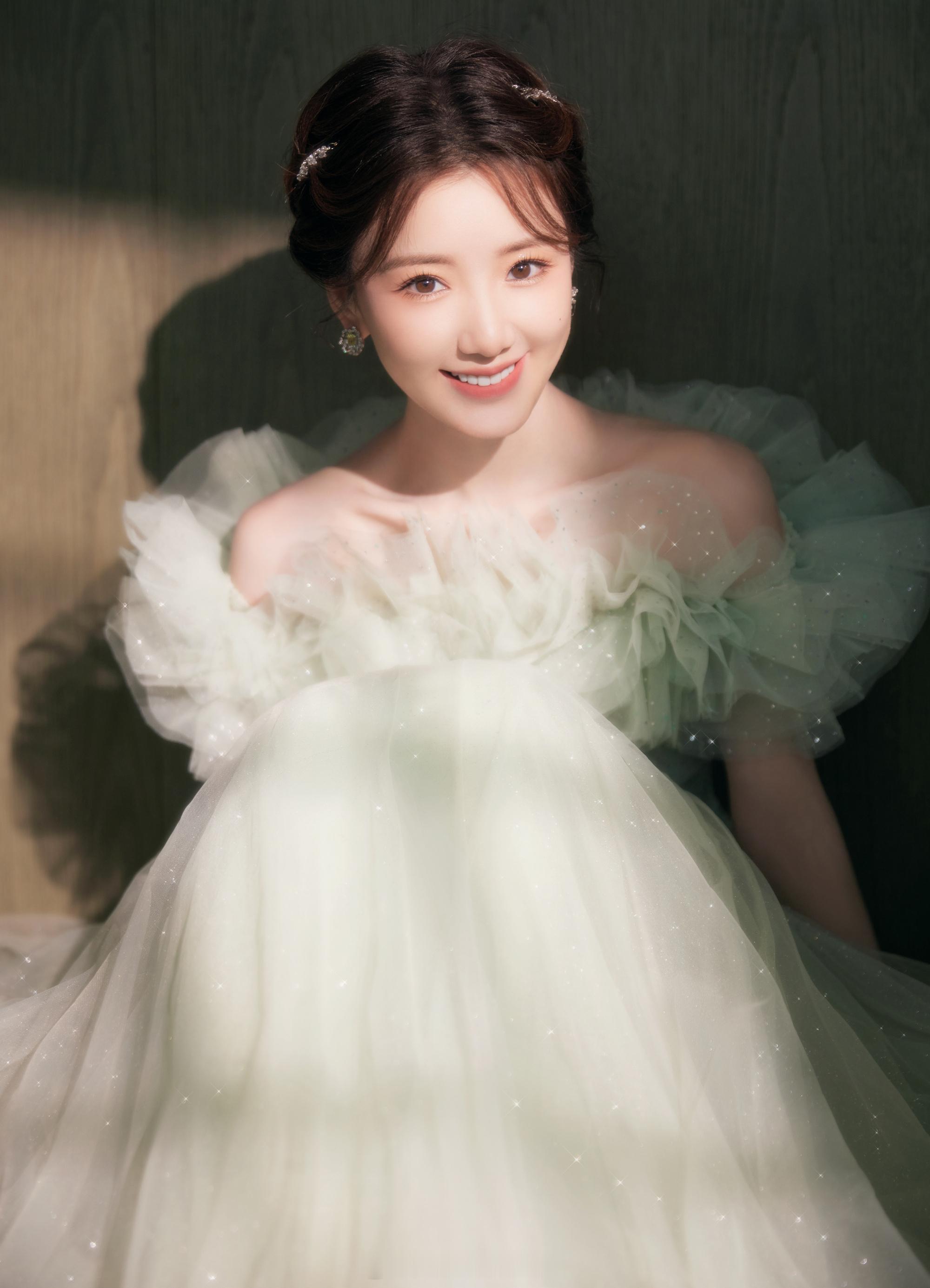 毛晓彤绿色碎钻星河纱裙清雅灵动