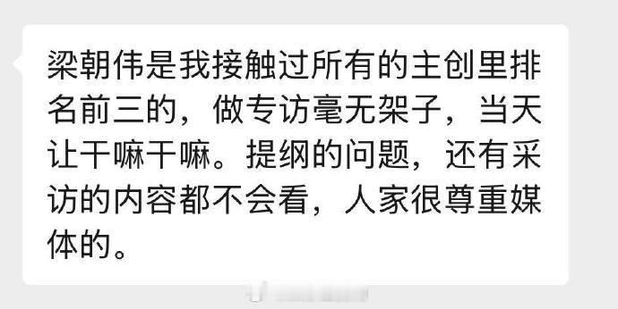建议内娱都学学梁朝伟 “内娱教科书”梁朝伟获业界一致好评!记者透露他采访从不预设条件,专业又尊重媒体工作,直言“内娱该学学”