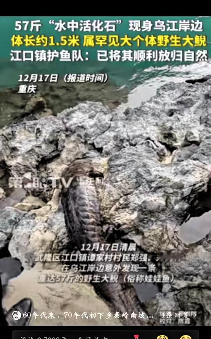 “幸亏发现及时!”重庆一村民干活时,突然发现石头缝有动静,他起初以为是毒蛇,吓得往后退了两步。 等他捡起树枝扒开旁边的杂草,才看清石缝里是一条体型不小的生物,扁脑袋粗尾巴,皮肤皱巴巴的 凑近了才认出,这竟是野生大鲵,也就是俗称的娃娃鱼。村民赶紧喊来附近干活的邻居,几个人围着石缝守着,谁都不敢随便碰,生怕伤着这个稀罕物,随后立刻掏出手机报了警。 等民警和林业部门的工作人员赶到,将大鲵捞出来称重、测量体长,大家才惊觉这大家伙足足有57斤,体长约1.5米。 专家介绍,野生大鲵是国家二级保护动物,对生存环境要求极高,只能在清澈流动的山泉溪水中存活,这条大鲵起码有二三十年的寿命,能在当地发现这么大的个体,十分罕见。 这些年野生大鲵数量锐减,主要是因为部分人非法捕捞贩卖,要知道一条几十斤的大鲵,得在无污染的环境里安稳生长几十年才能长成。 这位村民的做法值得所有人点赞,他没有因为好奇去折腾,更没动过贩卖换钱的心思,仅凭朴素的保护意识,第一时间选择守护和报警。 反观那些偷捕的人,明知违法还心存侥幸,最终只会付出法律代价。现在这条大鲵已经被送往救助站,检查无恙后就会被放归自然。