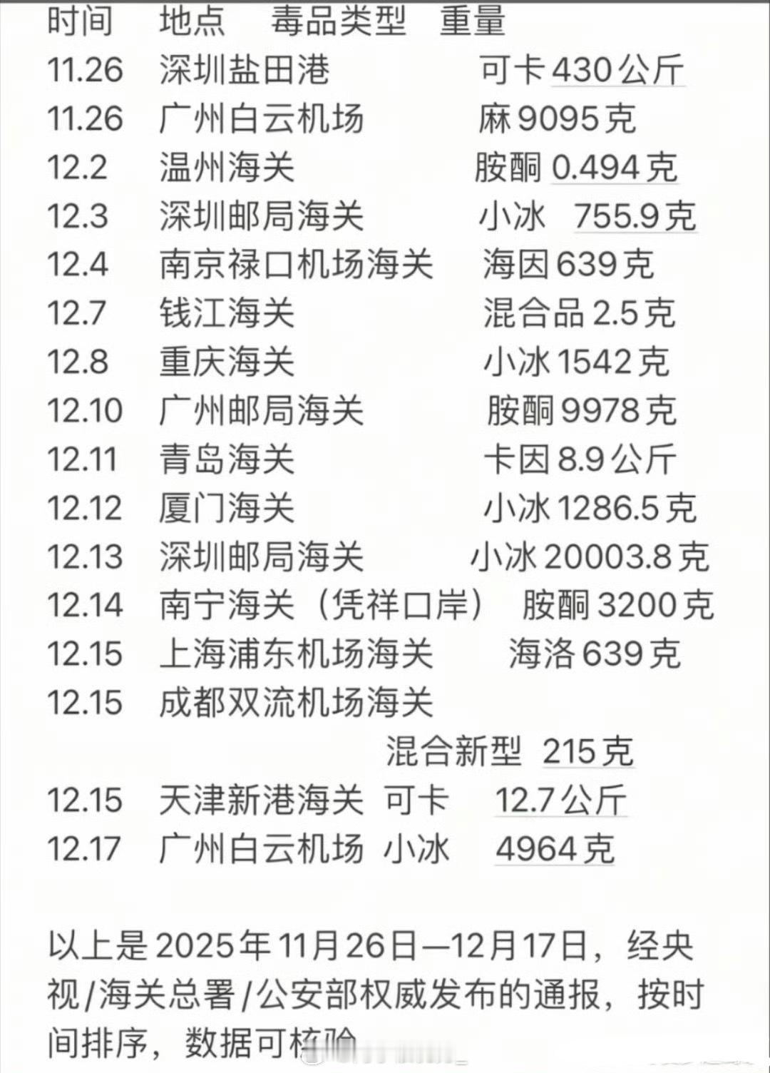 近期各海关查获的毒品数量