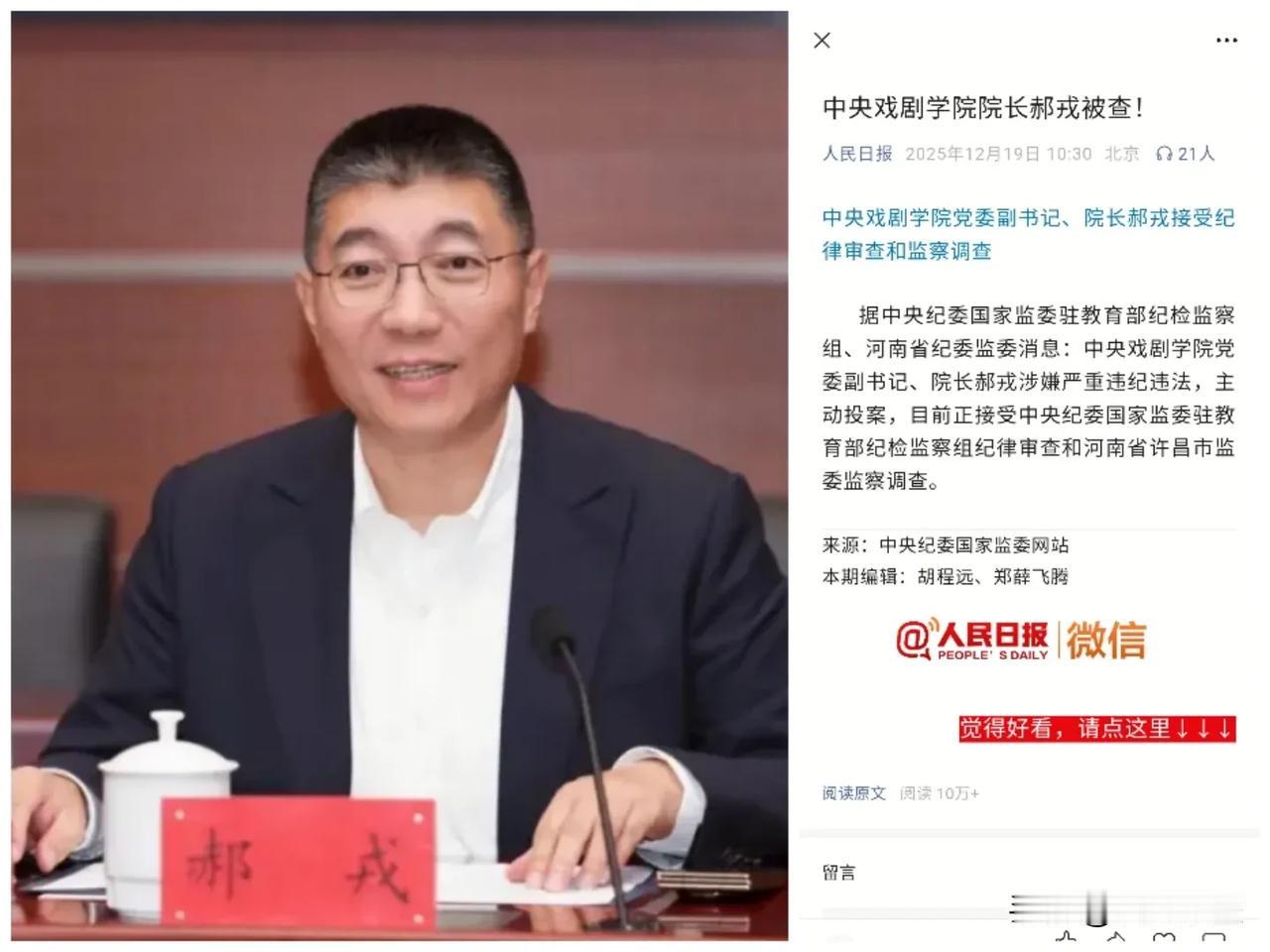 刚刚,人民日报发文,中央戏剧学院院长郝戎被查了,他是中央戏剧学院表演系,戏剧戏曲学硕士,也是科班出身!从2018开始担任院长,至此番被查已经干了7年了。 中戏作为培养艺术人才的摇篮,这么多年,从中戏走出了很多明星艺人,他们为我国演艺事业发展做出了很多贡献,不知道当他们看到院长被查的消息后会作何感想?