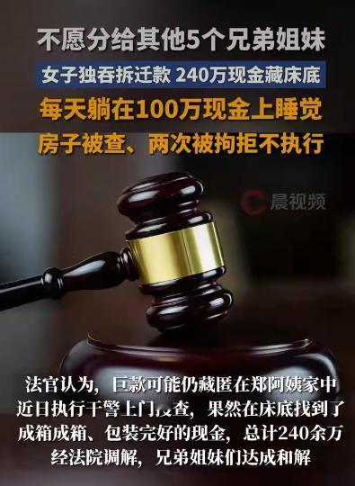 上海有户人家最近闹得沸沸扬扬,全因一笔280多万的拆迁款。这事儿得从长女郑阿姨说起,她户口一直挂在母亲的老宅里,虽说早就在别处分了福利房,也没在老宅住过,但2019年老宅拆迁时,她凭着户口便利,直接把补偿款全领走了。 母亲发现后气得不行,一纸诉状把女儿告上法庭。上海虹口法院审理后认定,这笔钱本就该归母亲所有,毕竟郑阿姨既没实际居住,又享受过福利分房。法院判她得把钱还给母亲,可判决刚生效,母亲突然病逝了。这下可好,原本要还的钱变成了遗产,六个兄弟姐妹都有份继承。 按理说,郑阿姨该把钱拿出来和兄弟姐妹平分,可她被钱迷了心窍,死活不肯。先是让丈夫撒谎说钱花光了,后来又改口说拿去理财了,凭证都销毁了。兄弟姐妹们多次上门要,她总找借口搪塞,甚至翻脸不认人。 法院可不是吃素的。法官仔细分析了郑阿姨的消费情况,觉得钱大概率还藏在她家里。于是带着搜查令上门,这一查可惊呆了众人床底下藏着100万现金,牛奶盒、纸箱里塞得满满当当,连包装都没拆。执行干警翻了个底朝天,总共搜出240多万现金,大部分还保持着原封不动的样子。 面对铁证,郑阿姨还在狡辩,说这些钱是自己攒的积蓄和儿子的工资,包装完好是怕发霉。直到法官耐心解释法律后果,她才承认,这些钱就是当年私吞的拆迁款。原来她提现后一直藏着,连包装都没敢拆,生怕露馅。 这事儿闹得太大,法院不得不采取强制措施。郑阿姨的唯一住房被查封,她本人也被司法拘留了两次。可法院考虑到她平时确实照顾父母比较多,连母亲的墓地钱都是她出的,决定组织调解,给亲情留个台阶。 调解会上,郑阿姨哭得一把鼻涕一把泪,求弟弟妹妹们减免部分本金和利息。兄弟姐妹们虽然心里委屈,但念及血脉亲情,最终还是松了口,同意减免迟延履行期间的利息。双方达成和解,这场持续数年的纠纷才算画上句号。 说到底,这钱本该是改善生活的福气,却成了撕裂亲情的祸根。郑阿姨为了守住钱财,不仅输了官司,还伤了兄弟姐妹的心。兄弟姐妹们虽然让了步,但心里的疙瘩哪那么容易解开?这事儿也给咱们提了个醒:钱财再重要,也比不上亲情珍贵。一家人过日子,还是得互相体谅,别为了点利益伤了和气。 来源:潇湘晨报