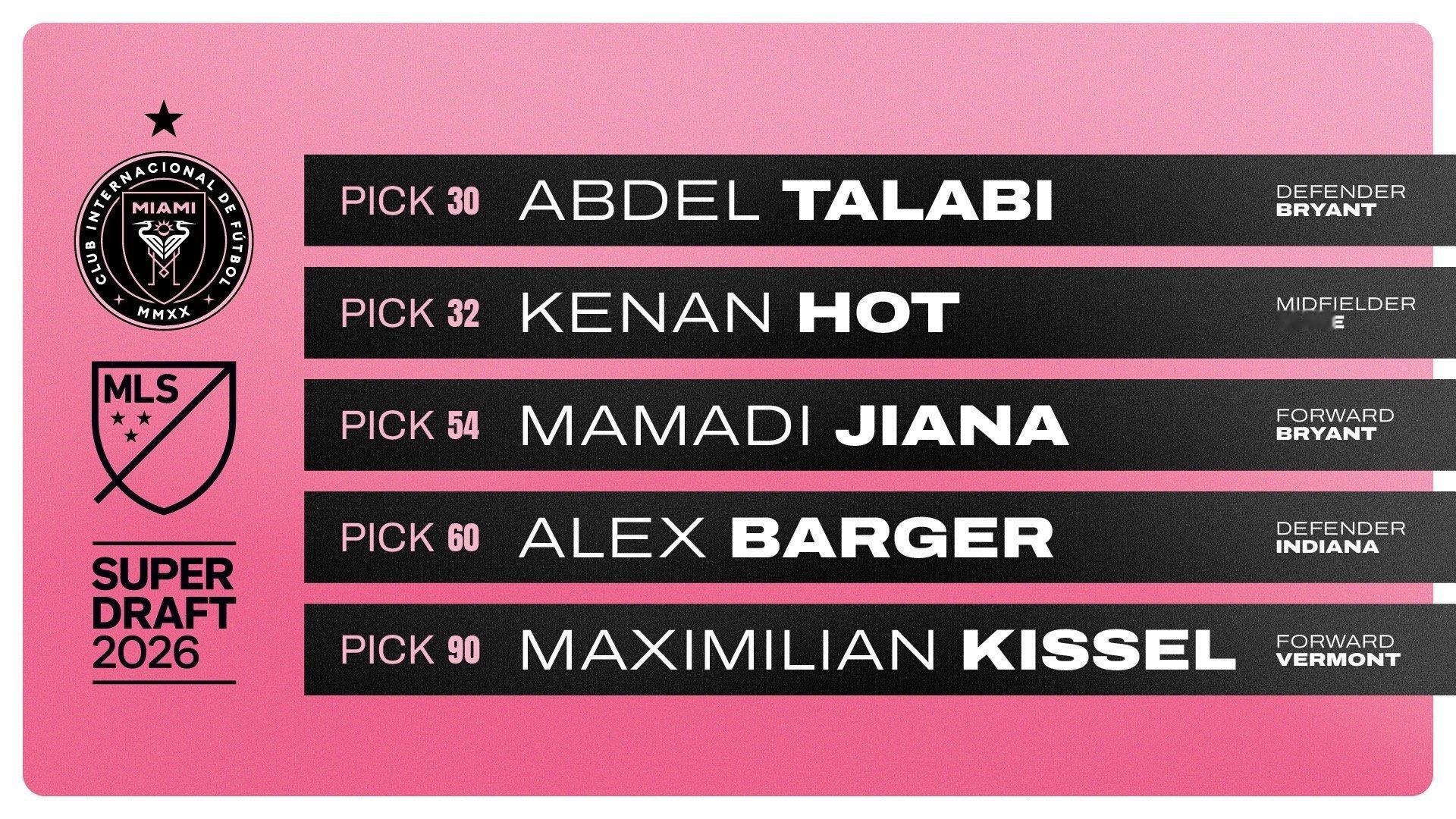 🚨迈阿密国际队在MLS超级选秀中的选秀结果:- 🇺🇸阿卜杜勒·塔拉比(24 岁后卫)。- 🇺🇸 肯南·霍特(21岁中场)。- 🇺🇸 马马迪·贾纳(22 岁前锋)。- 🇺🇸 亚历克斯·巴格(20岁后卫)。- 🇺🇸🇩🇪马克西米利安·基塞尔(23岁前锋)。他们都是大学生球员;他们将与职业队一起参加训练,然后马斯切拉诺将告诉俱乐部哪些球员值得获得永久合同。在去年的选秀中,没有一名被选中的球员与主队签约;只有一名球员与迈阿密学院签约。扬尼克·布莱特是迈阿密国际队选秀中最成功的一位;他在 2023 年被选中,现在是球队主力阵容中的关键球员。同样通过选秀进入球队的莱奥·阿方索在赢得 2024 年支持者盾的过程中发挥了重要作用,但此后他离开了俱乐部。一般来说,被选中并不保证一定能进入球队;我们拭目以待这五位球员的最终结果。mls迈阿密国际转会窗阿根廷球迷俱乐部超话