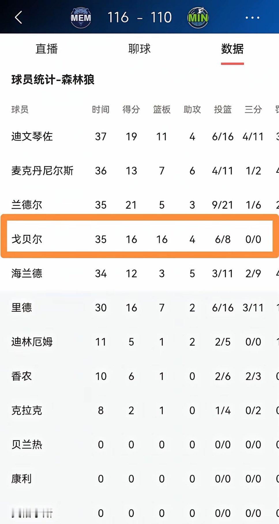 森林狼当家中锋戈贝尔真是太不受重视了!在今天森林狼主场以110:116不敌灰熊的比赛中,戈贝尔在进攻状态非常出色的情况下仅仅得到了8次出手,他的出手数是球队首发阵容里最少的。全场比赛下来,戈贝尔首发出战35分钟,投篮8中6,其中罚球6中4得到16分16篮板4助攻1抢断4盖帽。毫不夸张的说,如果戈贝尔能够多出手5次,森林狼完全有机会赢下比赛,可惜的是戈贝尔在森林狼阵中地位不高。