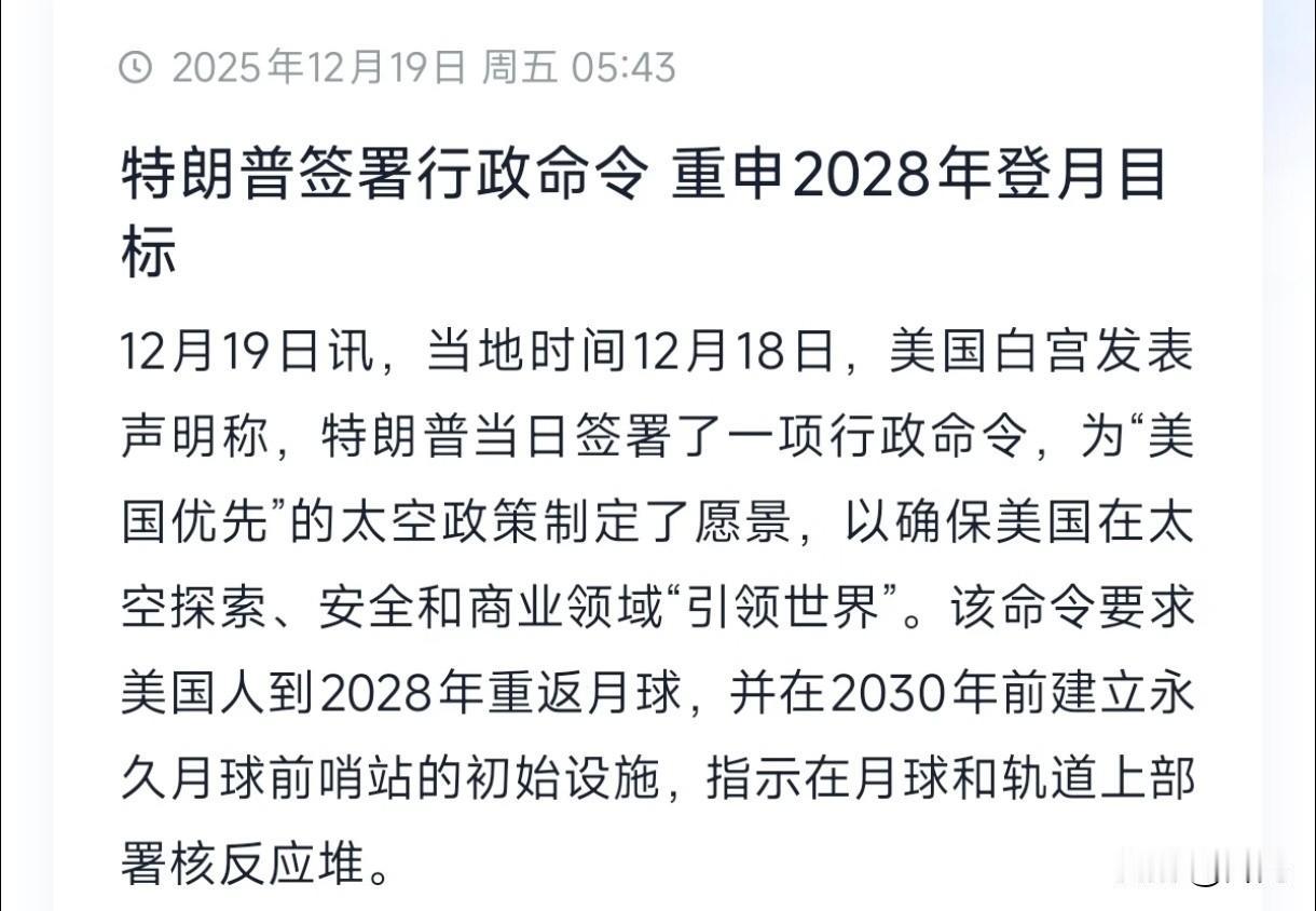 太震惊了!特朗普下签署行政命令要求美国人三年后必须登月!刚刚,美国白宫向外界发布了一则特朗普新签署的行政命令,宣称为了实现美国优先的太空政策,要确保美国在太空探索、安全和商业领域引领世界,所以特朗普通过行政命令的方式要求美国人在2028年重返月球,以确立美国在太空领域的领导地位。此外,值得注意的是相关行政命了还注明,到2030年美国要保证实现在月球上建立永久性前哨站的初步设施,以确保美国在太空的持续存在,并为下一步火星探索奠定基础。纵观相关内容,不得不说特朗普的这一命令有些太滑稽且让人震惊了,如果这种想法可以随意通过“行政法规”实现,美国NASA和马斯克显然不需要在通过科学的步骤在努力了。