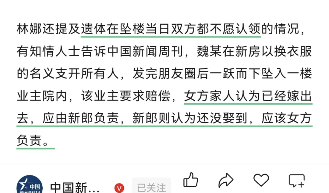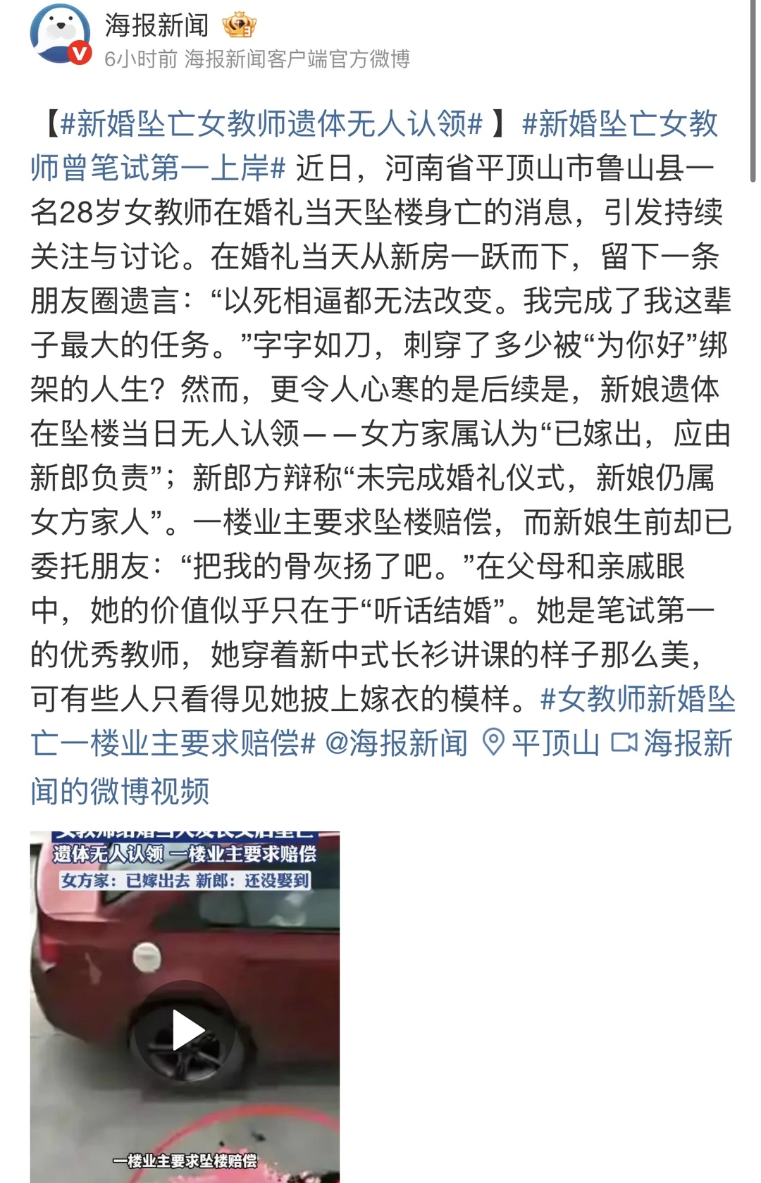 看到这条新闻,心脏像被重击。一位笔试第一、气质卓然的优秀女教师,在她人生本应最幸福的“婚礼”当天,选择从新房一跃而下。她的遗言——“以死相逼都无法改变。我完成了我这辈子最大的任务”——字字泣血,是对“为你好”式绑架最绝望的反抗。