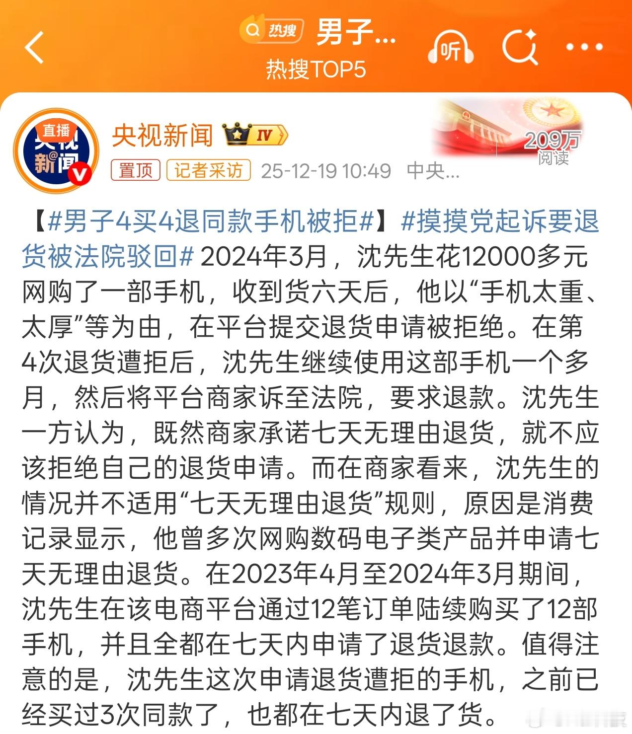 摸摸党或者想当开箱数码博主党才会这样操作吧买新手机到七天就退,这下老实了,多次申请无理由退货会被平台拒绝,奔走相告吧男子4买4退同款手机被拒