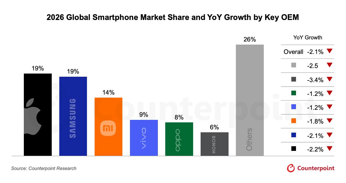 Counterpoint:受存储成本上升影响,2026 年全球智能手机出货量预期将年减 2.1%。智能手机平均售价预测上修至年增6.9%(9 月预测为 3.6%)。