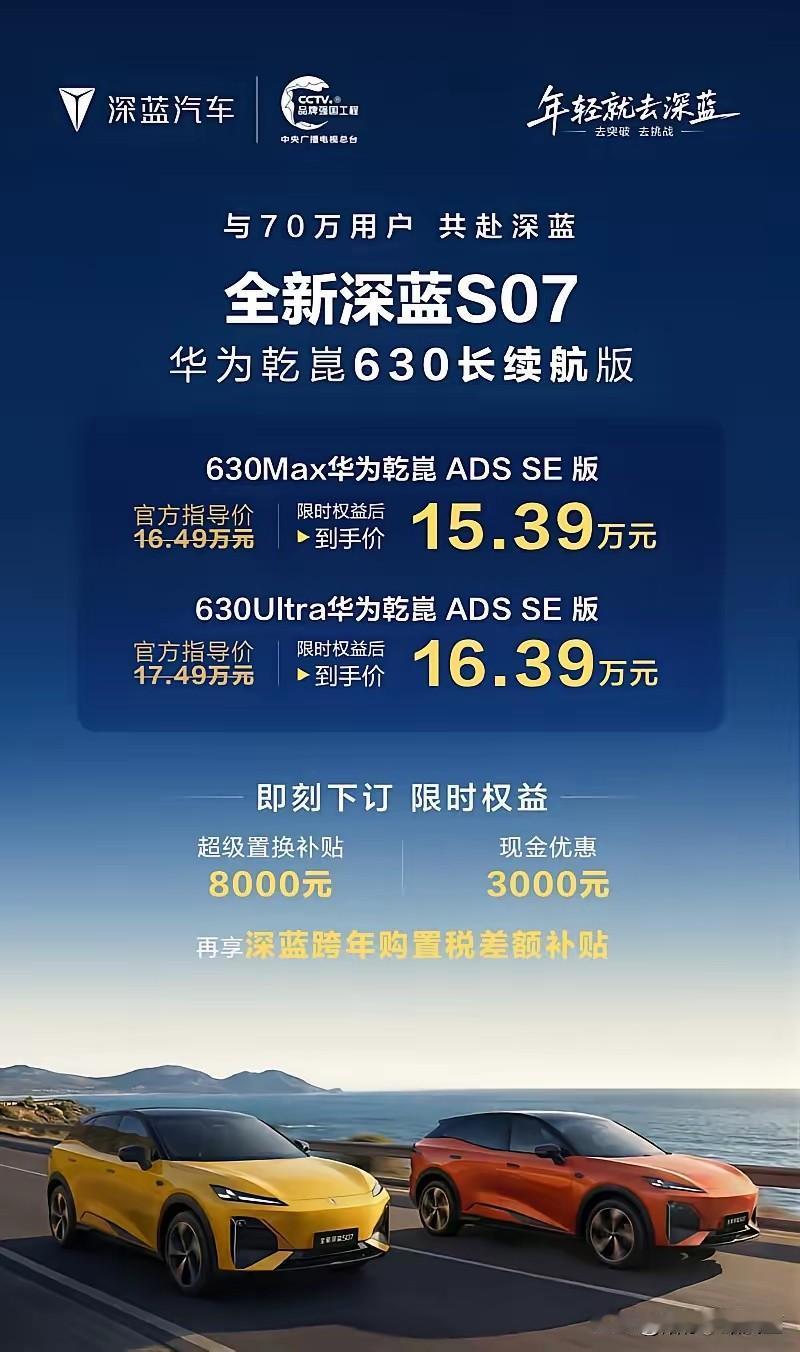 不得不承认,这实力杠杠滴啊! 2022年,深蓝汽车卖出33354辆。 2023年,深蓝汽车卖出136912辆。 2024年,深蓝汽车卖出243894辆。 2025年截至12月中旬,深蓝汽车交付超30多万辆。 作为一名兢兢业业教书育人的老教师,退休5年后,我最大的心愿就是带着老伴走遍祖国的大江南北,阅尽大好河山。 于是,挑选一辆代步车,便成了我俩的心结,果然还是儿子最懂我,直接给我推荐了深蓝S07华为乾崑630长续航版。 上周在儿子的劝说下,我拉着老伴去试驾,当场就拍板下单! 老伴作为颜控,直接被轿跑SUV的流畅身姿吸引住了! 无边界前脸科技感拉满,贯穿式尾灯一亮,辨识度直接封神,开出去自驾游回头率绝对爆表。 坐进车内更是惊喜满满,15.6英寸中控屏清晰又丝滑,高通骁龙8295P芯片搭配Deepal OS 4.0系统。 操作起来,比我那部老年机还要顺手,老伴刚学了两分钟就会调导航和切歌。 最让我们满意的是,那对双零重力座椅,靠背一调,整个人都陷进去了,长途坐车腰也不再又酸又麻了。 后排还有个4.2英寸小屏,老伴儿坐在后面就能操控空调,简直不要太贴心! 2900mm的轴距,5座布局宽敞得很,我们俩的行李箱和帐篷,加上折叠椅塞进485L的后备箱,还绰绰有余。 放倒后排直接扩容到1425L,下次带孙子露营都够用。 续航也超牛,77.94kWh大电池,CLTC纯电续航630km,我俩平时买菜逛街,一周充一次电都嫌多。 就算跨省自驾游,也不用频繁找充电桩。 还有华为乾崑ADS SE智驾系统,25颗传感器可不是摆设! 高速上能自己跟车和变道,城区里走走停停也丝滑,全场景智能泊车更是我的救星。 FSD可变阻尼减震加HRS液压回弹止动器,过减速带稳稳当当,刹车不点头、过弯不晃悠。 连老伴晕车的老毛病都没再犯,舒适性和驾驶乐趣直接拉满。 15.39万-16.39万的价格,性价比超高,颜值、智慧、续航全在线,简直是为爱出游的朋友量身打造! 最后,我还整理出4个购车优惠攻略,想买的朋友可以看看。 1. 到店试驾礼:预约试驾就能领定制车载收纳箱,放零食、杂物超实用。 2. 金融补贴礼:首付低至1.5万,分期享2年0息,月供压力直接减半。 3. 置换升级礼:旧车置换最高享8000元补贴,换车党直接冲。 4. 车主专享礼:首任车主享终身免费基础保养加免费道路救援,用车成本降到底。 车子还没到手,我就已经开始脑补开着它,带着老伴去泰山看日出,去云南山间赏云海的画面啦!