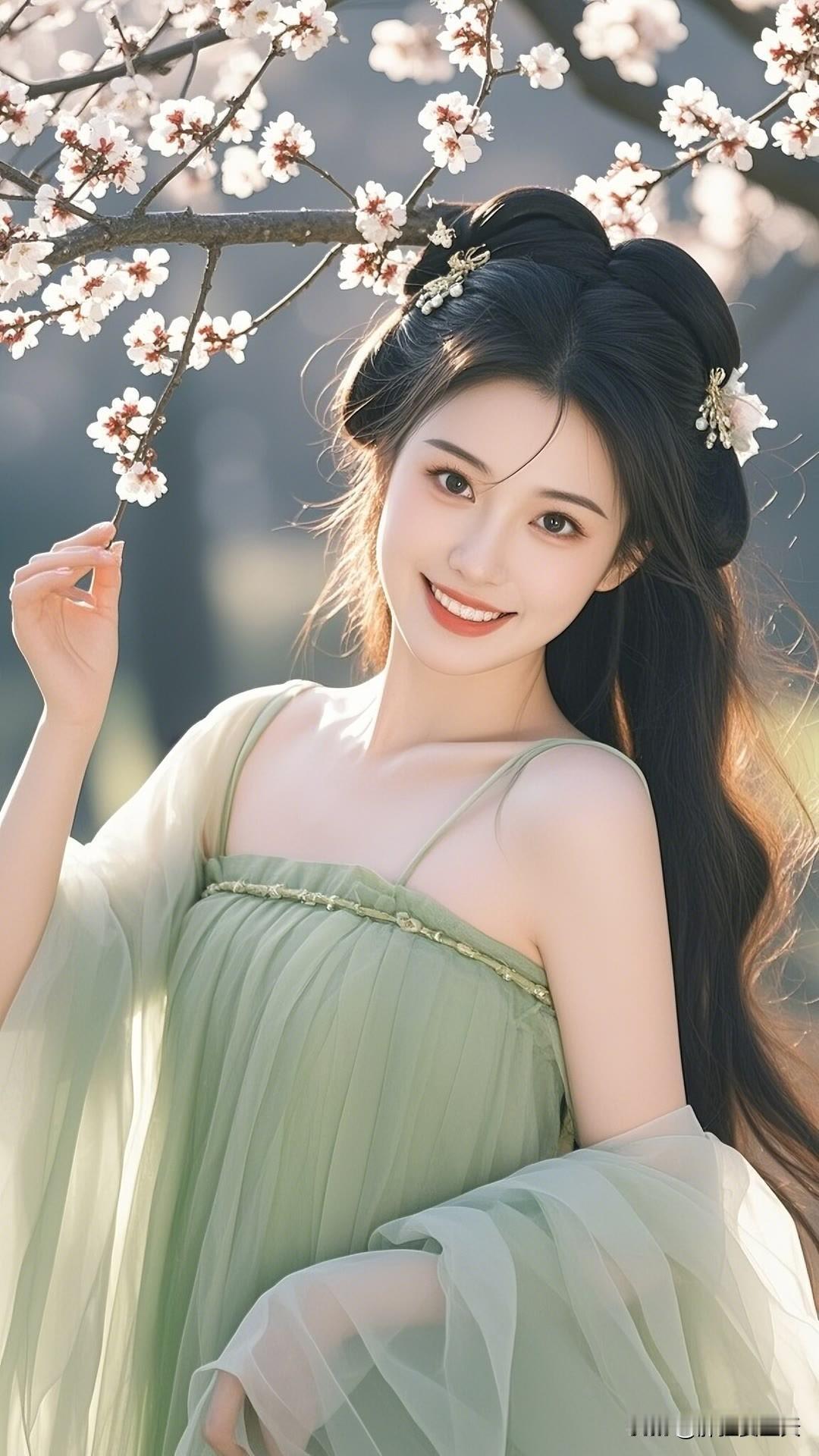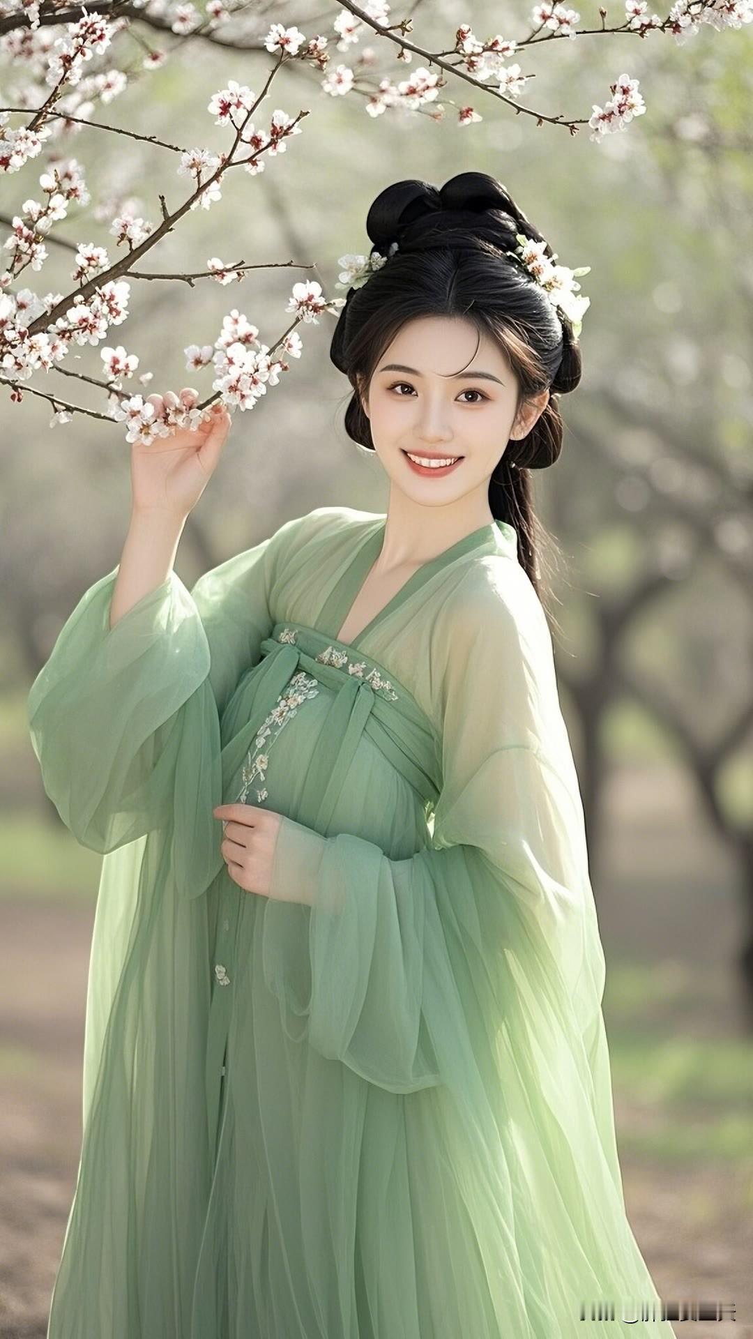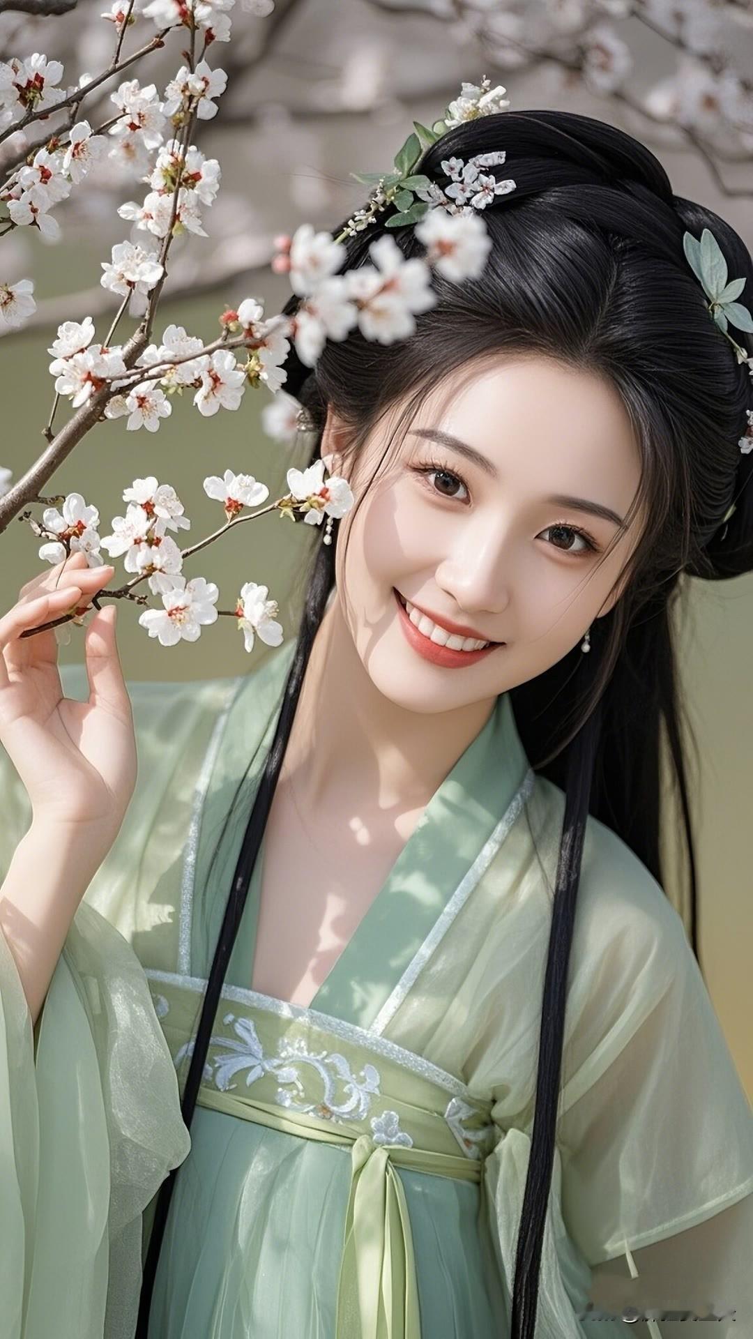 春日杏花盛开时,汉服佳人笑颜展。绿衣白花相映衬,古典韵味盈心间。美女人像群 高清美女