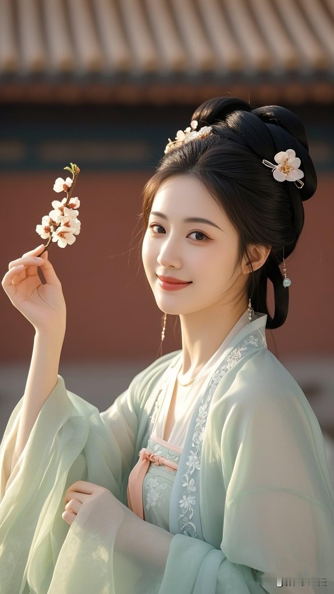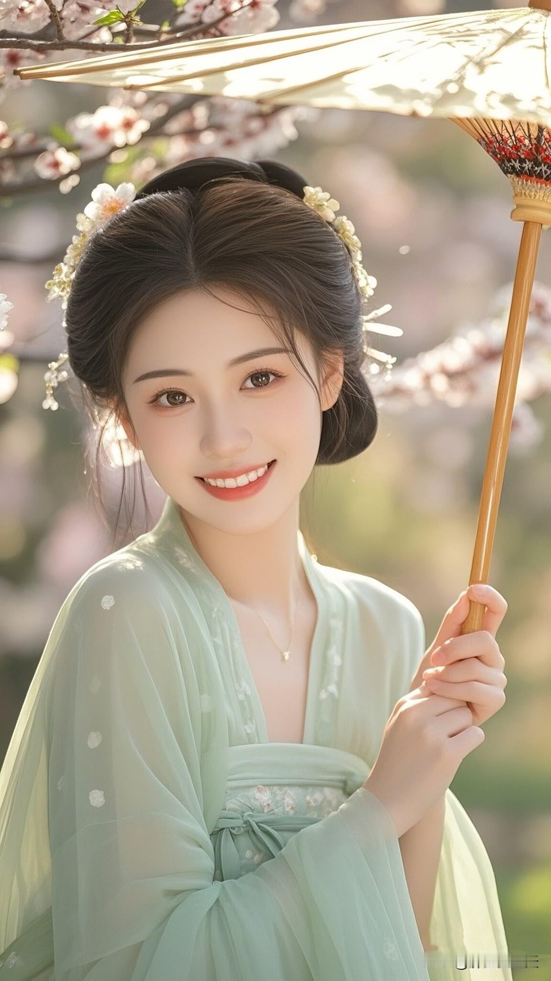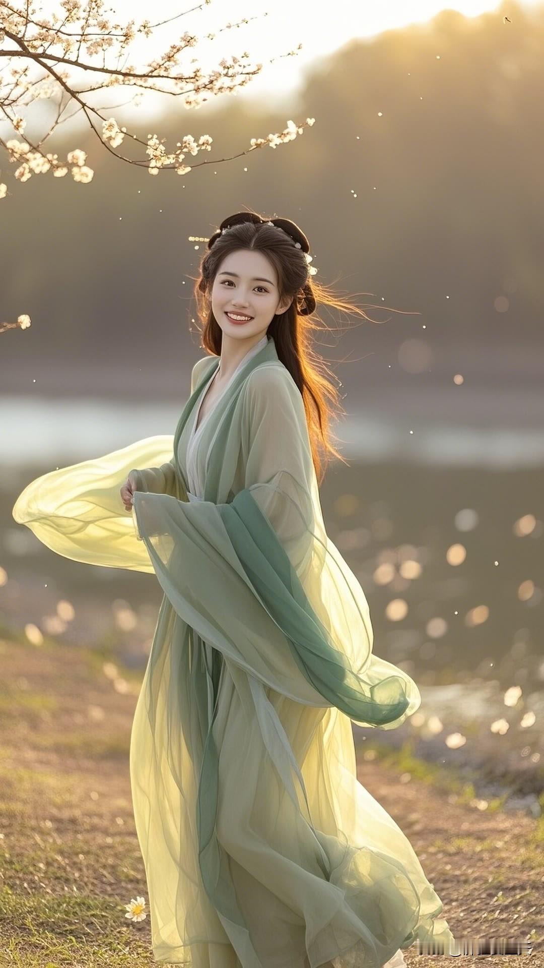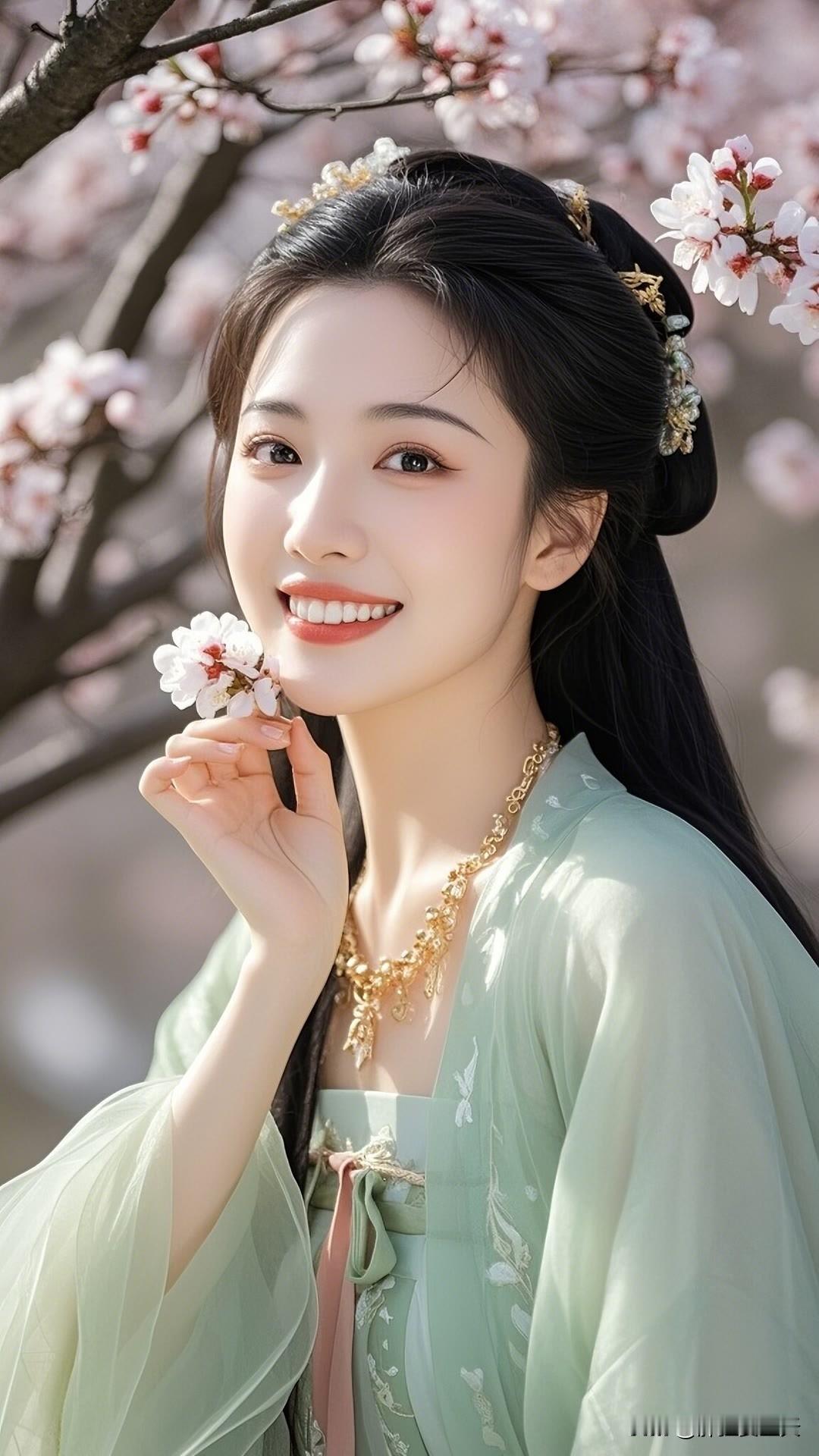 春日杏花盛开时,汉服佳人笑颜展。绿衣白花相映衬,古典韵味盈心间。美女人像群 高清美女