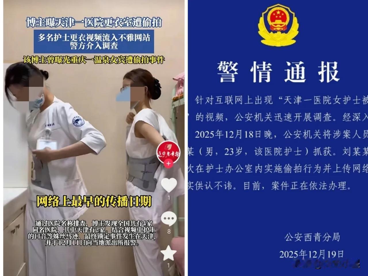 果然是熟人作案!天津某医院护士更衣室内被偷拍这件事有结果了,嫌疑人已经被抓获,是该院的一名男护士,年龄才23岁。 这名男护士已经承认了,自己曾经多次在办公室、更衣室偷拍别人换衣服,并把视频发到某网站上! 其实,被发现有人偷拍时,很容易就能想到极有可能是内部人干的,因为这些地方外人一般进不去。 这名男护士今年才23岁,估计也是刚毕业不久便进入了护士队伍,在医院里男护士比较少,相对还是比较吃香的!不好好干事业,非要搞这些乱七八糟的,世上没有后悔药,等待他的将是严厉的处罚,不但正式工作可能丢了,还有可能被px!
