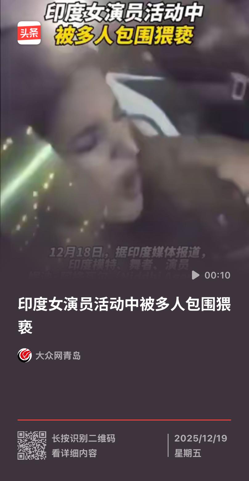 印度女星活动遭围堵猥亵 车内崩溃痛哭 乱象为何屡禁不止 12月18日 印度女星妮迪·阿格瓦尔新片发布会沦为惊魂现场。一群男子冲破形同虚设的安保 饿狼扑食般围拢上来 扯拽衣服 触摸隐私部位 举着手机疯狂拍摄。女星被慌忙塞进车 双手捂脸颤抖痛哭 往日荧幕上的光彩消失殆尽。 此类事件在印度绝非个例。今年3月 有女星遭围堵时哭喊“别碰我”。10月 有女舞者被强行拽下舞台。7月 短短15天内 就爆发478起性骚扰案。更荒诞的是 施暴者往往全身而退。此前478起案件的涉案人员 最高罚款仅100卢比 只够买一杯奶茶。 印度女性安全处境堪忧。安保如同纸糊 司法定罪率不足三成 案件审理动辄耗时七八年。部分群体秉持奇葩观念 将骚扰责任甩给受害者。性教育长期缺失 让恶行逐渐演变成见怪不怪的常态。 荧幕上充斥女性觉醒爽剧 现实里光鲜女星都难逃魔爪。印度女性出门如同闯雷区。这不是简单的安保漏洞 是亟待从根源上修正的社会沉疴。