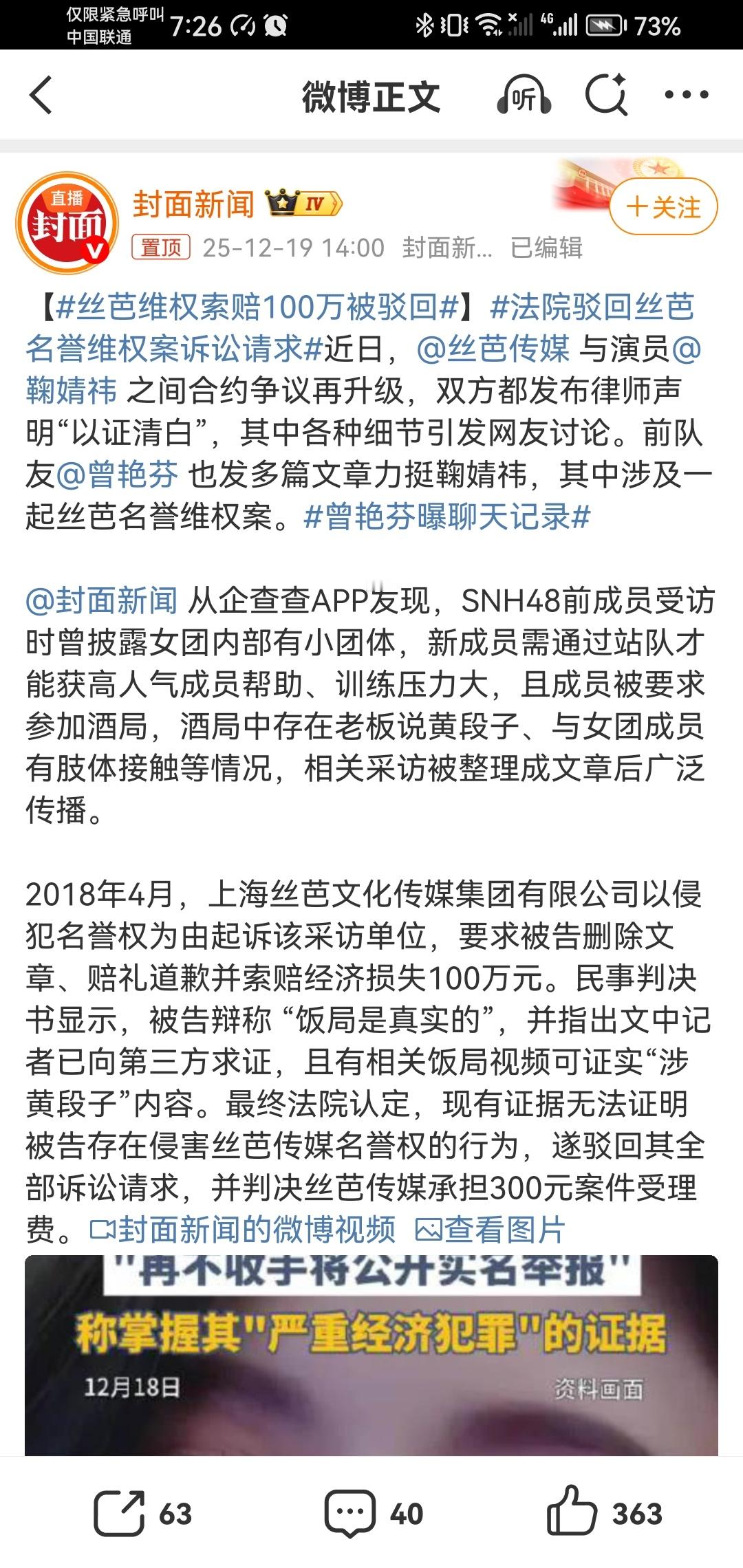 饭局是真实的,所以法院判决实锤了丝芭的女演员们参与饭局?还有视频,还有涉黄段子?丝芭维权索赔100万被驳回