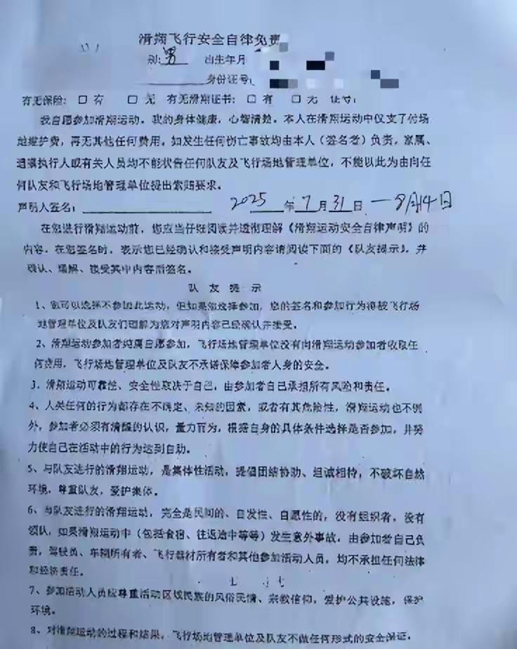六旬老人在临夏训练滑翔伞坠亡,调查结论系意外,女儿将提起行政复议:曾签“生死状”这起令人痛心的事件引发了广泛关注。老人女儿要提起行政复议,这背后想必有着她诸多的考量。虽说调查结论是意外,但“生死状”三个字却又让事情变得复杂起来。 “生死状”真的能成为免责的筹码吗?女儿或许觉得,即便签了这样的协议,也不能忽视滑翔伞运营方可能存在的问题。比如,训练设施是否完善,教练的指导是否到位,安全保障措施是否落实。 据了解,老人一直对滑翔伞运动充满热情,六旬的年纪依然怀揣着挑战自我的梦想。可谁能想到,这一次勇敢的尝试却成了生命的终点。女儿在悲伤之余,也在为父亲的遭遇寻求一个更公正的说法。 而滑翔伞运营方目前尚未对此事做出更多回应。接下来行政复议的结果又会如何呢?是维持意外的结论,还是会有新的发现和转变?大家都在拭目以待。希望相关部门能彻查此事,给老人家属,也给社会大众一个满意的交代。