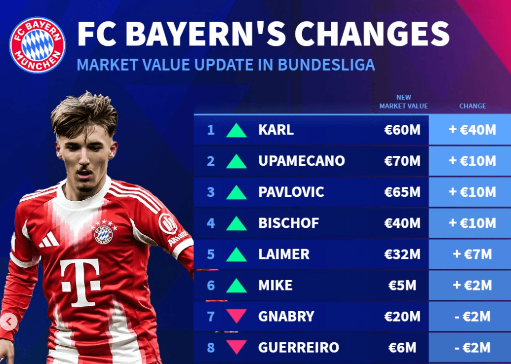 虎扑12月19日讯德国转会市场更新了拜仁球员身价,其中,小将卡尔暴涨4000万身价至6000万,6人上涨9人下跌。