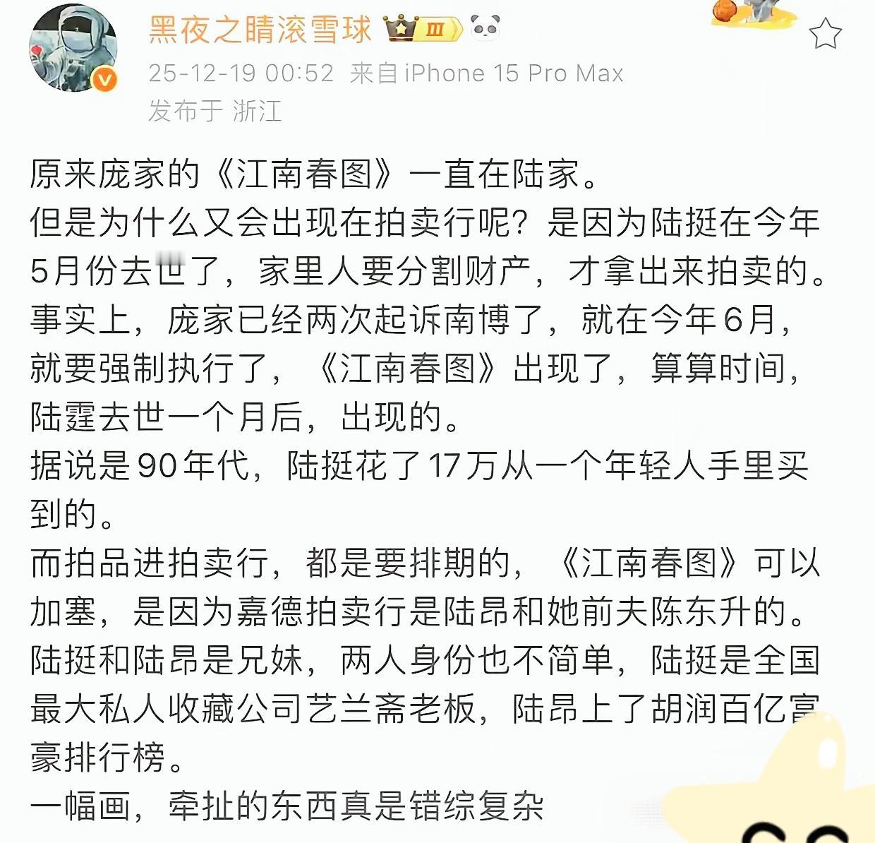 救命稻草出现了! 那就是陆家 南京博物院icon可要把握机会,一查到底,别在关键的时刻掉链子,这陆家就是突破口,可别再错过了最佳时机。 8800万天价的仇英古画,早就是南京艺兰斋陆霆的收藏,90年代就到了陆家手里,2014年庭审时南博还甩锅庞家卖画,现在看全是掩人耳目。陆霆去世后家人分家产卖字画,才让这幅画露了面,不然还得藏多久。 调查的核心从来不是画在谁家,而是它怎么从南博“跑”出来的。 顺着陆家这条线往上查,谁移交的、谁批准的、有没有合规手续,一查一个准。真相最怕拖延,越拖越容易有猫腻,辜负的不只是庞家的信任,还有公众对文物保护的期待。 你觉得顺着陆家这条线索,能顺利挖出当年文物流出的完整链条吗?