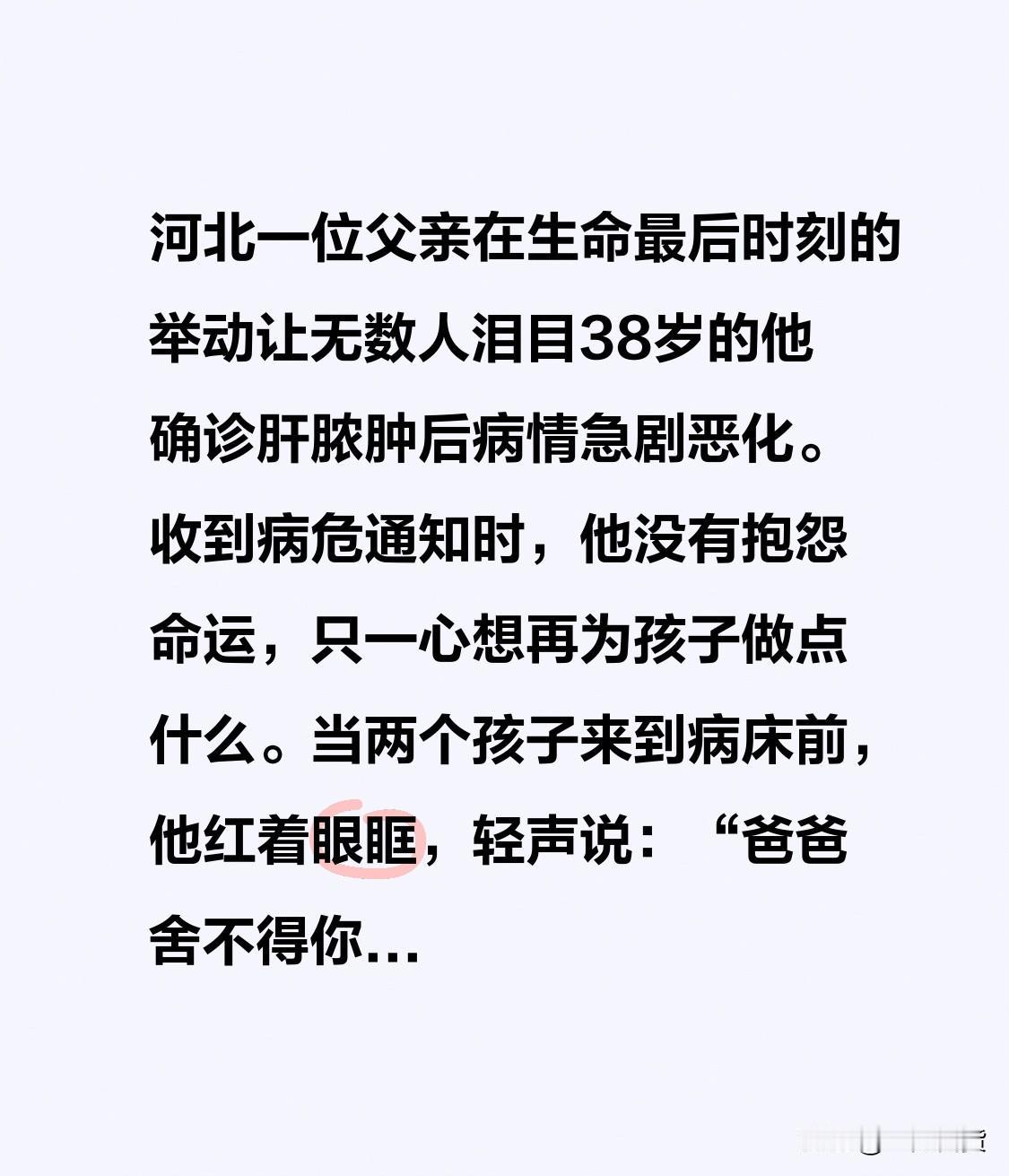 河北一位父亲在生命最后时刻的举动 让无数人泪目 38岁的他确诊肝脓肿后病情急剧恶化。收到病危通知时,他没有抱怨命运,只一心想再为孩子做点什么。 当两个孩子来到病床前,他红着眼眶,轻声说:“爸爸舍不得你们。”随后他提出为孩子们剪指甲。孩子伸出手,他握着小手慢慢修剪,每个动作都柔软而认真。一旁的妻子说,生病以来他一直很坚强,那是他第一次落泪。 几天后,当有人问他是否放心不下孩子时,他又一次流下眼泪。几分钟后,他静静离开了。 生命尽头,所有的牵挂与不舍,都化在了那最后一次轻轻的触碰里。 父爱无声,却响彻一生。你有被父亲默默守护的瞬间吗? 父爱如山