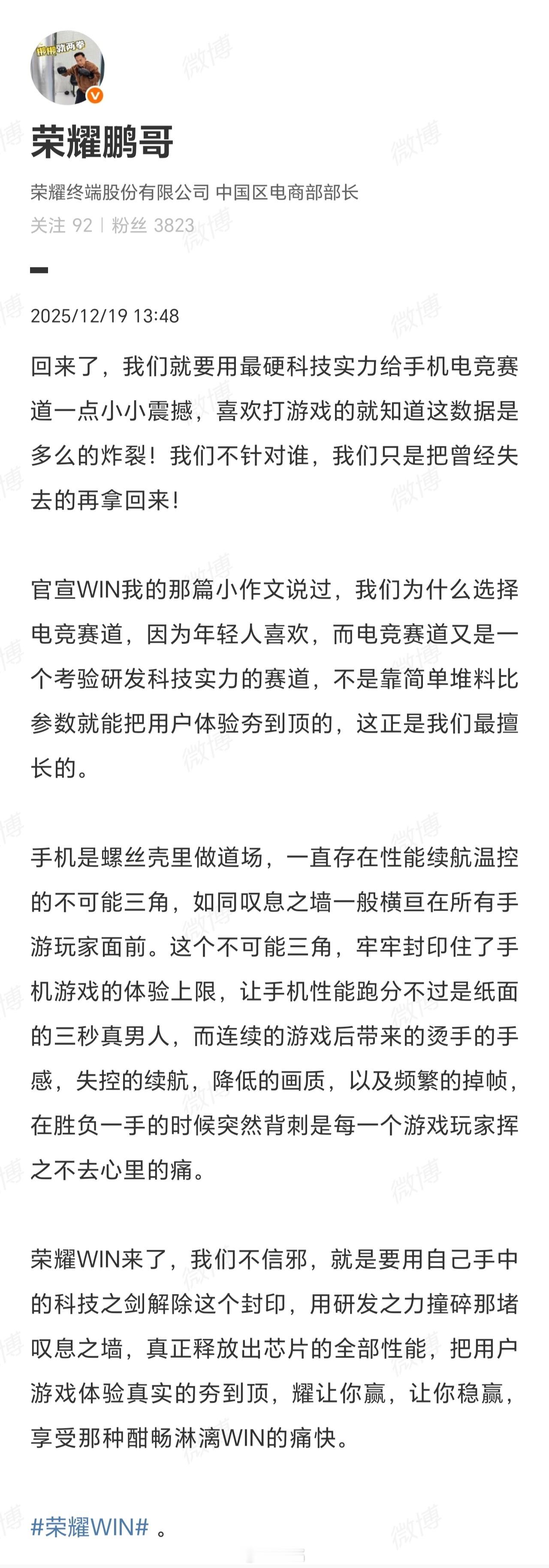 荣耀WIN系列主打电竞体验,以自主研发的硬科技突破手游“性能、续航、温控”不可能三角。不追求参数堆砌,着力解决玩家实际痛点——发热、掉帧、续航崩溃,释放芯片真实性能,实现持久稳定的高帧游戏表现。荣耀这下是要重新定义游戏手机体验,让玩家畅享稳赢体验了!期待