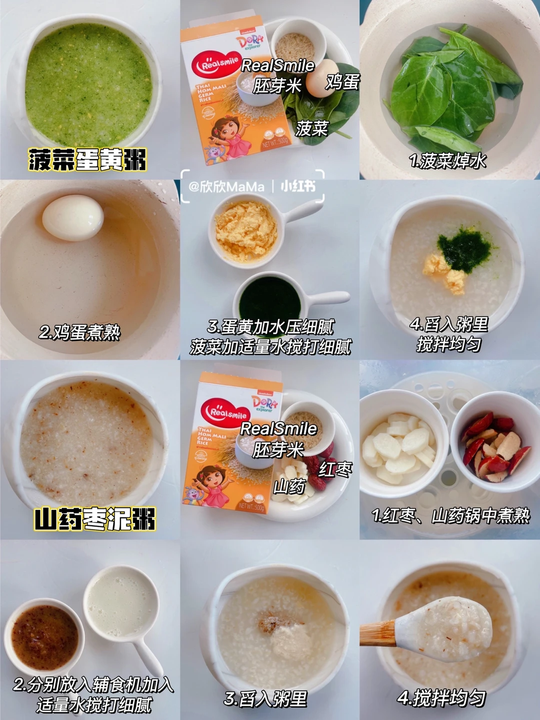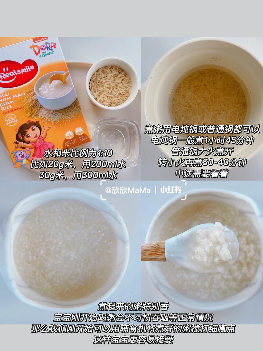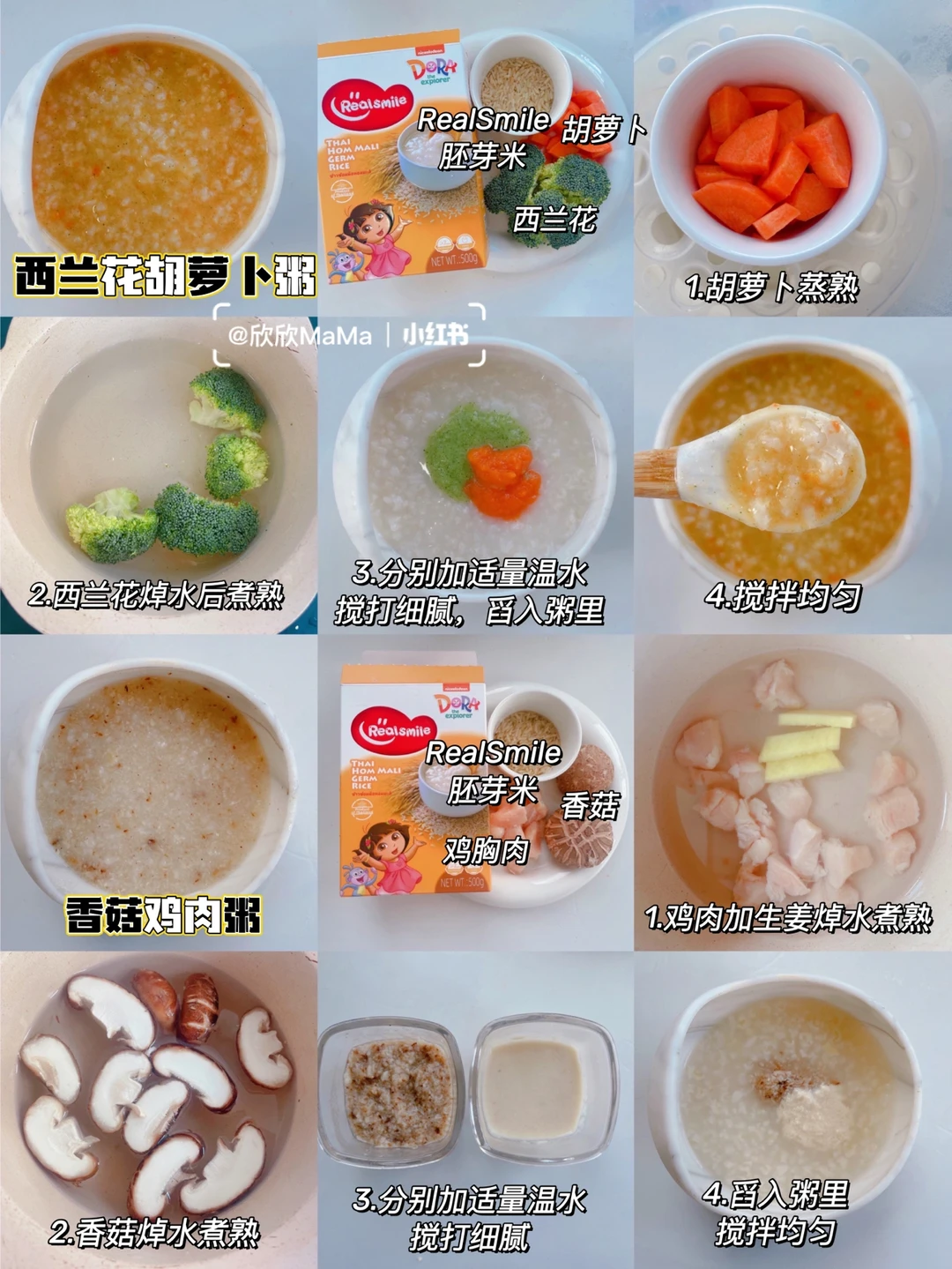 宝宝到7个月左右就可以吃粥啦~今天我来分享9款入门级营养辅食粥~好吃营养~养好脾胃~易吸收好消化 〰️〰️ ⚠️粥的做法: 1️⃣:胚芽米淘洗2遍,提前用温水泡30分钟左右,放入bb锅,或辅食锅中煮1小时45分钟 2️⃣:也可以用普通锅,大火煮开转中小火煮40分钟,中途需要看着 . 🔸第一次喝粥的几个小贴士: 1️⃣:因为胚芽米活性较高,建议收到后放冰箱储存, 2️⃣:刚开始先吃10倍粥,米和水的比例1:10 (例如米20g、加200ml的水,米30g、加300ml的水)再9倍、8倍、7倍… 3️⃣:食材刚开始可以先打泥,在宝宝适应喝粥后可以增加颗粒感 4️⃣:宝宝刚开始喝粥会不习惯吞咽等正常情况,那么我们刚开始可以用辅食机将煮好的粥搅打细腻点,带点颗粒感得米粥宝宝更能接受哦 . 🔻煮粥我用的是RealSmile泰国进口茉莉香胚芽米,留胚率高达92%,保留了黄色的糊粉层,营养更丰富!长型的米粒,适合长牙期的宝宝锻炼咀嚼能力,煮出来的粥炒鸡软糯清香!新出的爱探险的朵拉联名包装也炒可爱哦! 〰️〰️ 🌈9款详细做法👀图3-图7 1️⃣菠菜猪肝粥 2️⃣南瓜粥 3️⃣山药紫薯粥 4️⃣西兰花胡萝卜粥 5️⃣香菇鸡肉粥 6️⃣枣泥南瓜粥 7️⃣番茄鳕鱼粥 8️⃣菠菜蛋黄粥 9️⃣山药枣泥粥 . 这几款都是欣欣宝宝比较爱吃的,荤素搭配营养开胃!7个月刚加辅食粥先从比较简单的食材搭配开始哦!健脾养胃易吸收好消化~ 做法简单,又营养好吃!妈妈们快get起来吧~ 有疑问🤔️也可以评论区留言喔😄 💡关注我带您解锁更多辅食制作