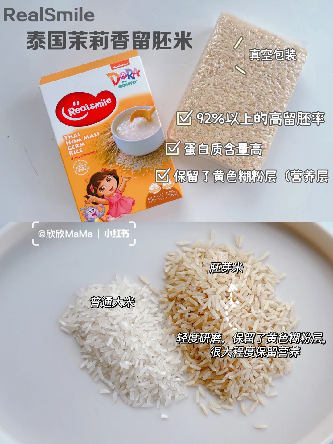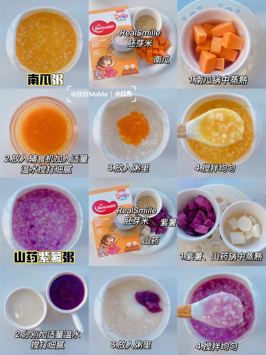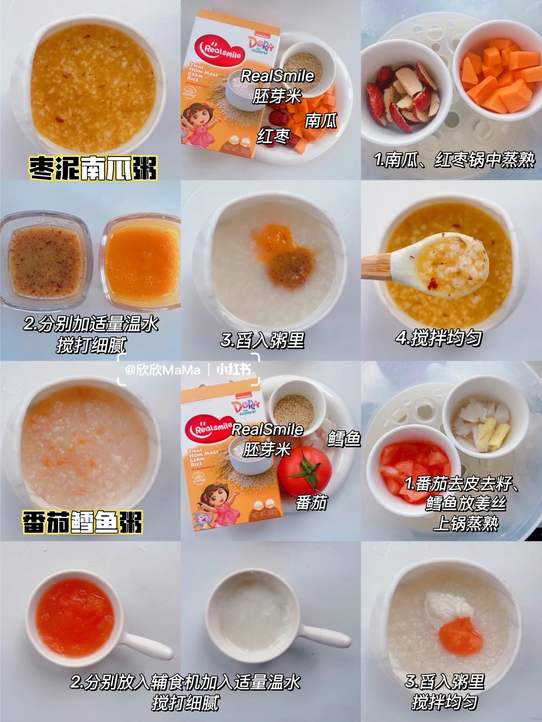 宝宝到7个月左右就可以吃粥啦~今天我来分享9款入门级营养辅食粥~好吃营养~养好脾胃~易吸收好消化 〰️〰️ ⚠️粥的做法: 1️⃣:胚芽米淘洗2遍,提前用温水泡30分钟左右,放入bb锅,或辅食锅中煮1小时45分钟 2️⃣:也可以用普通锅,大火煮开转中小火煮40分钟,中途需要看着 . 🔸第一次喝粥的几个小贴士: 1️⃣:因为胚芽米活性较高,建议收到后放冰箱储存, 2️⃣:刚开始先吃10倍粥,米和水的比例1:10 (例如米20g、加200ml的水,米30g、加300ml的水)再9倍、8倍、7倍… 3️⃣:食材刚开始可以先打泥,在宝宝适应喝粥后可以增加颗粒感 4️⃣:宝宝刚开始喝粥会不习惯吞咽等正常情况,那么我们刚开始可以用辅食机将煮好的粥搅打细腻点,带点颗粒感得米粥宝宝更能接受哦 . 🔻煮粥我用的是RealSmile泰国进口茉莉香胚芽米,留胚率高达92%,保留了黄色的糊粉层,营养更丰富!长型的米粒,适合长牙期的宝宝锻炼咀嚼能力,煮出来的粥炒鸡软糯清香!新出的爱探险的朵拉联名包装也炒可爱哦! 〰️〰️ 🌈9款详细做法👀图3-图7 1️⃣菠菜猪肝粥 2️⃣南瓜粥 3️⃣山药紫薯粥 4️⃣西兰花胡萝卜粥 5️⃣香菇鸡肉粥 6️⃣枣泥南瓜粥 7️⃣番茄鳕鱼粥 8️⃣菠菜蛋黄粥 9️⃣山药枣泥粥 . 这几款都是欣欣宝宝比较爱吃的,荤素搭配营养开胃!7个月刚加辅食粥先从比较简单的食材搭配开始哦!健脾养胃易吸收好消化~ 做法简单,又营养好吃!妈妈们快get起来吧~ 有疑问🤔️也可以评论区留言喔😄 💡关注我带您解锁更多辅食制作