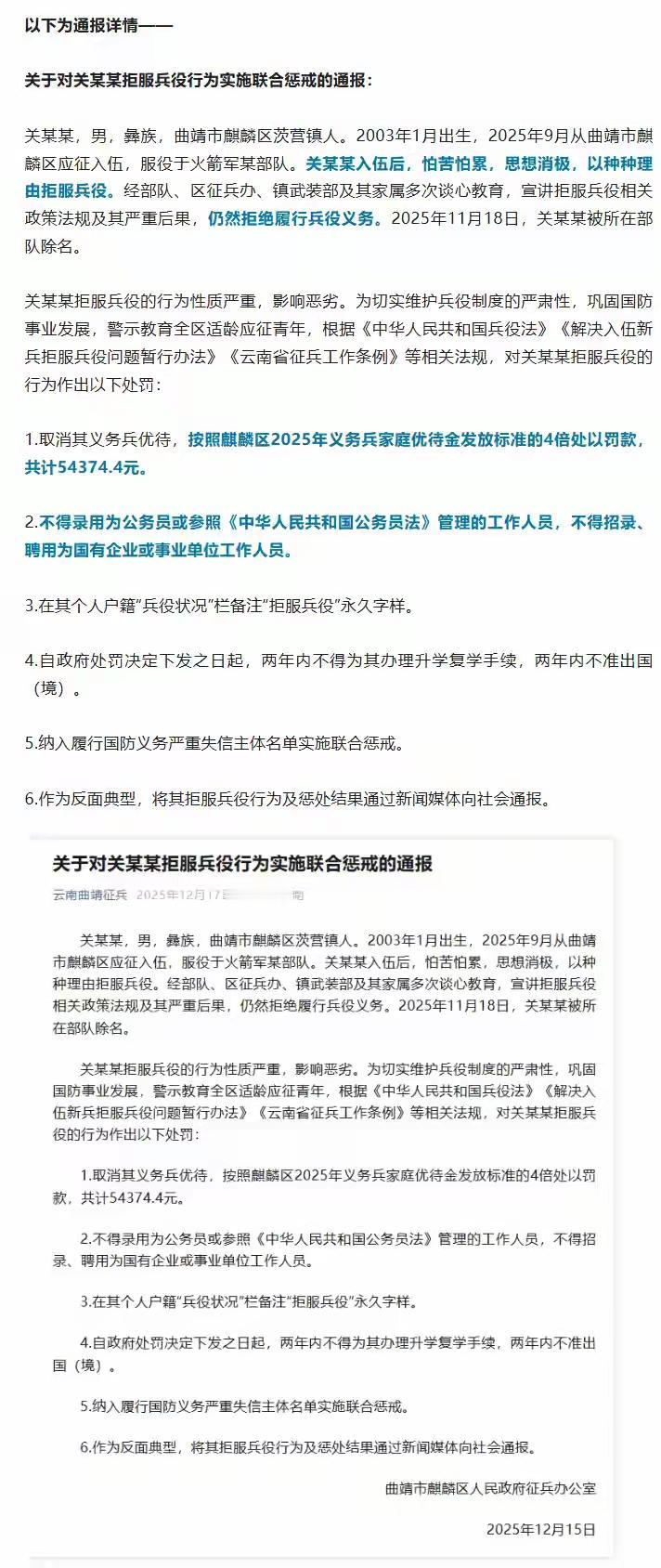 22岁云南小伙关某某,能挤进火箭军那可是祖坟冒青烟的顶配荣耀啊,结果他倒好,刚进军营就嫌苦嫌累,直接撂挑子当逃兵。 要说部队和地方也真是仁至义尽了,生怕他一时糊涂毁了自己,部队、武装部联合家人轮番苦劝,嘴皮子都快磨破了,他愣是油盐不进,铁了心要当“刺头”,死活不想回去。 可任性总是要付出代价的不是吗?而且代价还不小呢!11月他被部队除名,12月就被官方拉出来公开处刑:先是五万多的罚款直接砸脸上,再是户口本上永久钉死“拒服兵役”的耻辱标签;公务员、国企的铁饭碗彻底泡汤,升学、出国的路全被卡死,连个人信用都被拉黑。咱就说短暂的吃苦受累换后半生的一帆风顺不好吗?甘愿当逃兵一辈子抬不起头,这又何必呢,以后有他悔的! 讲真,这波真不是官方狠,是他自己作的哇!一手好牌打得稀巴烂!服兵役是每个公民的法定义务,哪能由着性子耍无赖?这种人不严惩,怎么对得起那些戍守边疆、保家卫国的子弟兵!火箭军特种部队