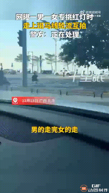 广西北海一处街头,有一男一女专挑红灯亮起的时候,来到斑马线上拍照,周边车来车往,