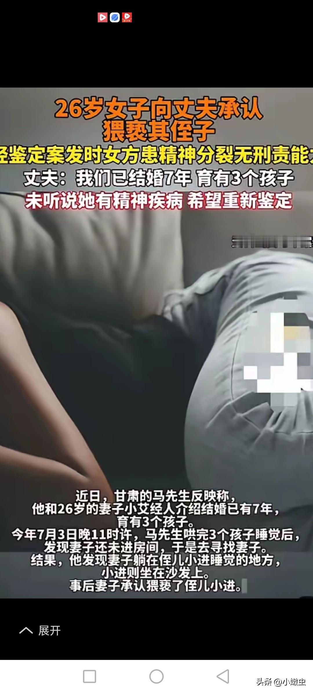 12岁侄儿遭亲婶婶猥亵,每天做噩梦。 性格变成沉默。 经鉴定,作案时女子患有精神分裂病。 女子丈夫称,从未发现有病史,请求重新鉴定,追究责任。 男子哄完三个孩子去睡觉,发现妻子不在身旁,去寻找她,发现她在自己侄儿床里,丈夫问完,妻子承认侵犯侄儿。 他与小艾结婚七年,育有三孩子。 12岁侄子放假,被婶婶猥亵后。 就自己离家出走,家里人找了一天才找回来,对于发生这样事,两兄弟一致认为小艾问题,如果精神分裂就免刑事案件。 所以追究重新鉴定,丈夫也彻底提出离婚。 这件事,你觉得受害人是谁,其实对整个家族都是不光彩的事,特别是侄儿心智未成熟,将来怎么面对三个堂兄弟姐妹亲人,如何面对自己亲叔。 小小年纪,就被披上阴影。 家族名声也败坏了,道德伦理。