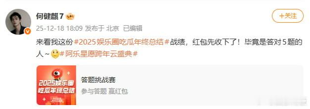 何健麒也抢红包何健麒答对了5题 谁懂啊!答完5题就到处炫耀求夸奖的样子,简直是周宴京从屏幕里跑出来了,臭屁帅哥实锤!何健麒