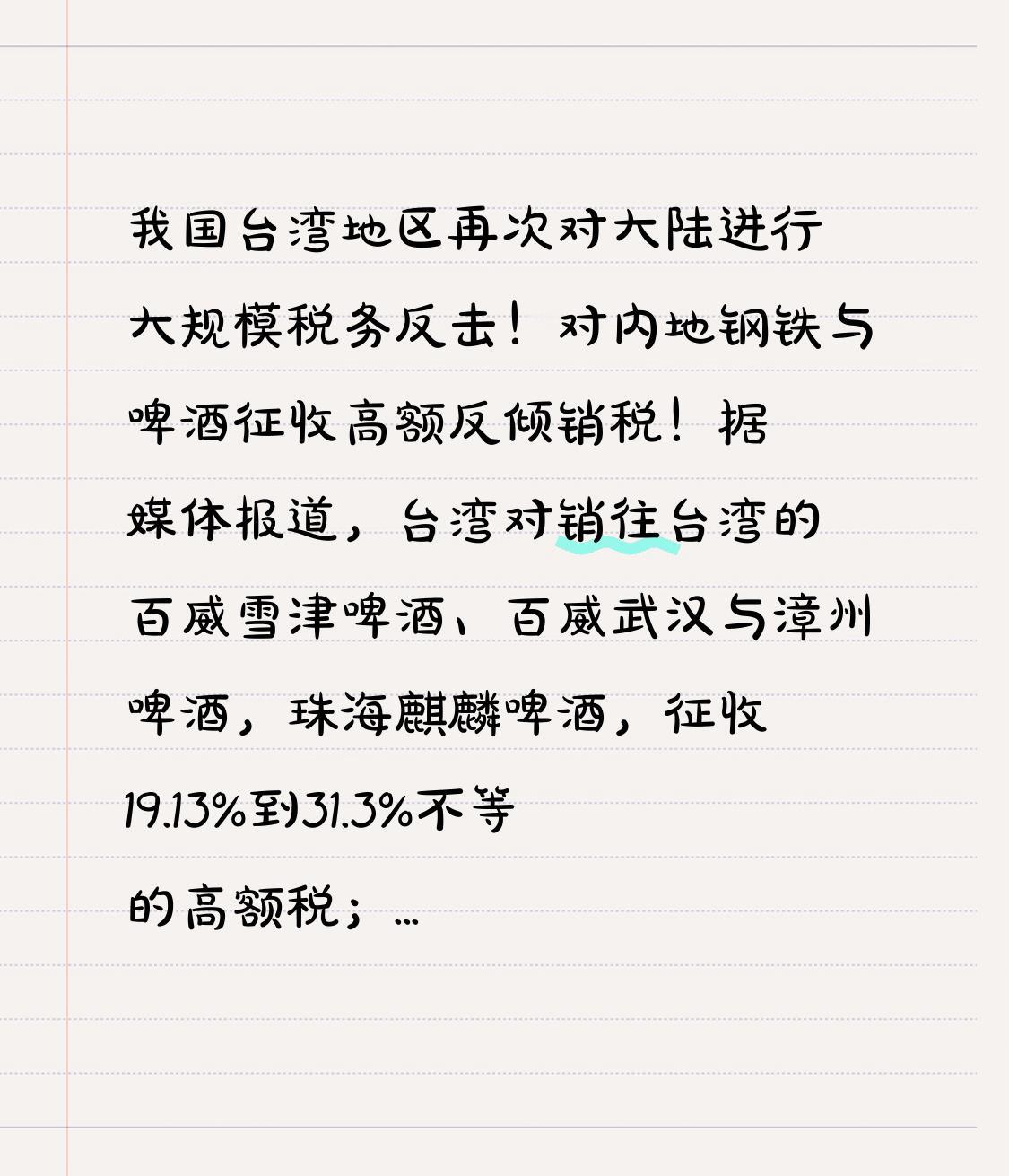 太气愤!我国台湾地区再次对大陆进行大规模税务反击!对内地钢铁与啤酒征收高额反倾销税! 据媒体报道,台湾对内地产的百威雪津啤酒、百威武汉与漳州啤酒,珠海麒麟啤酒,征收19.13%到31.3%不等的高额税;对大陆宝钢等多家钢材企业征收20%左右的倾销税! 这就是喂不熟的白眼狼,网友呼吁,对我国台湾地区全面取消优惠措施,真的迫在眉睫,一味慈悲只会换来无耻的索取!