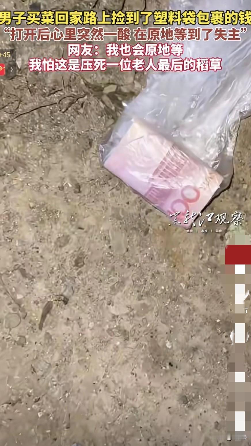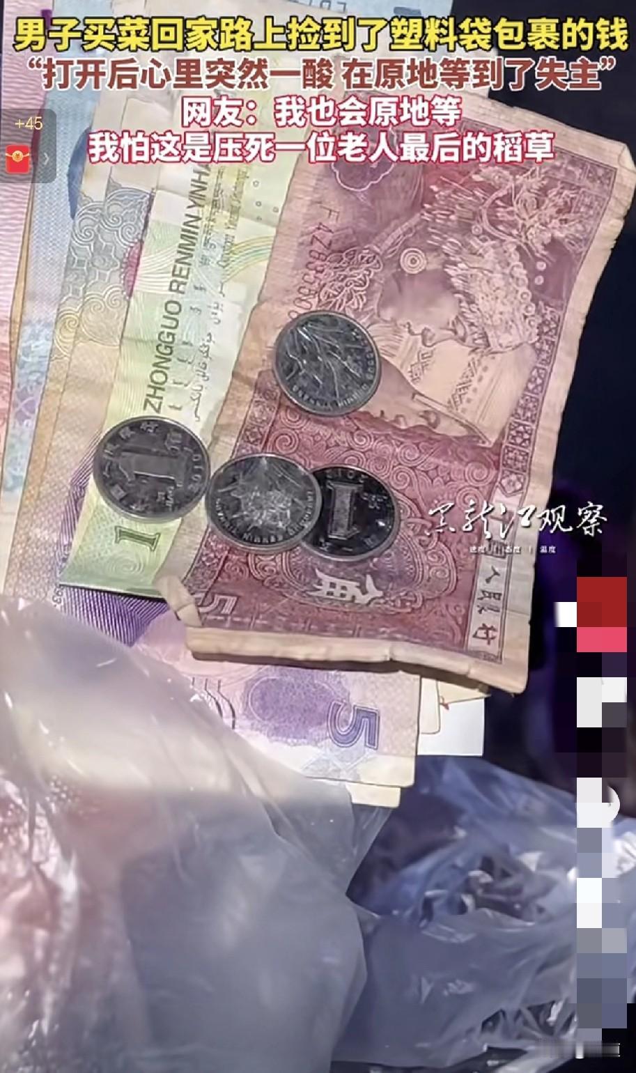 按理说捡到钱应该高兴,可这个男子却高兴不起来。 黑龙江男子买菜回来的路上,发现地上一个方便袋里有钱,他拣起来一看,里面有一百一十一元五角的都有。 他看着这些钱心里一酸,这个钱应该是一位老人丢的,他决定站在原地等失主。 后来失主果然找来了,钱归原主。 许多网友看了都表示不会要这个钱,也会在原地等失主。 看来还是善良的人多啊,假如是你拣到了,你会原地等失主吗?