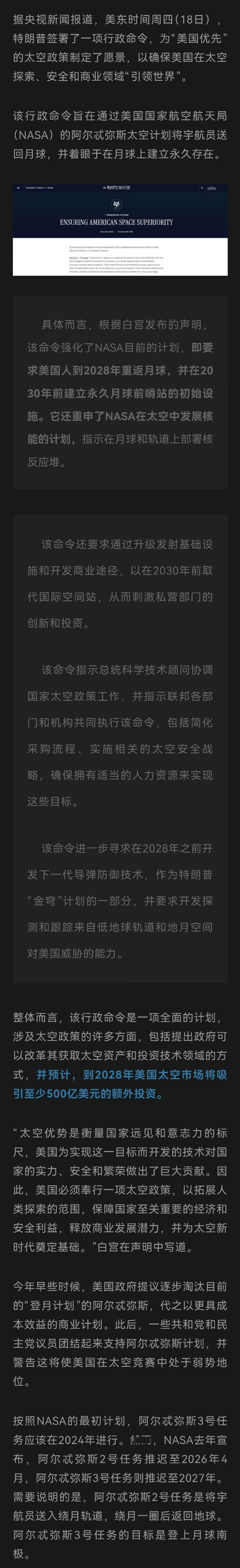 美国总统特朗普签署行政令:2028年登月 !烽火问鼎计划