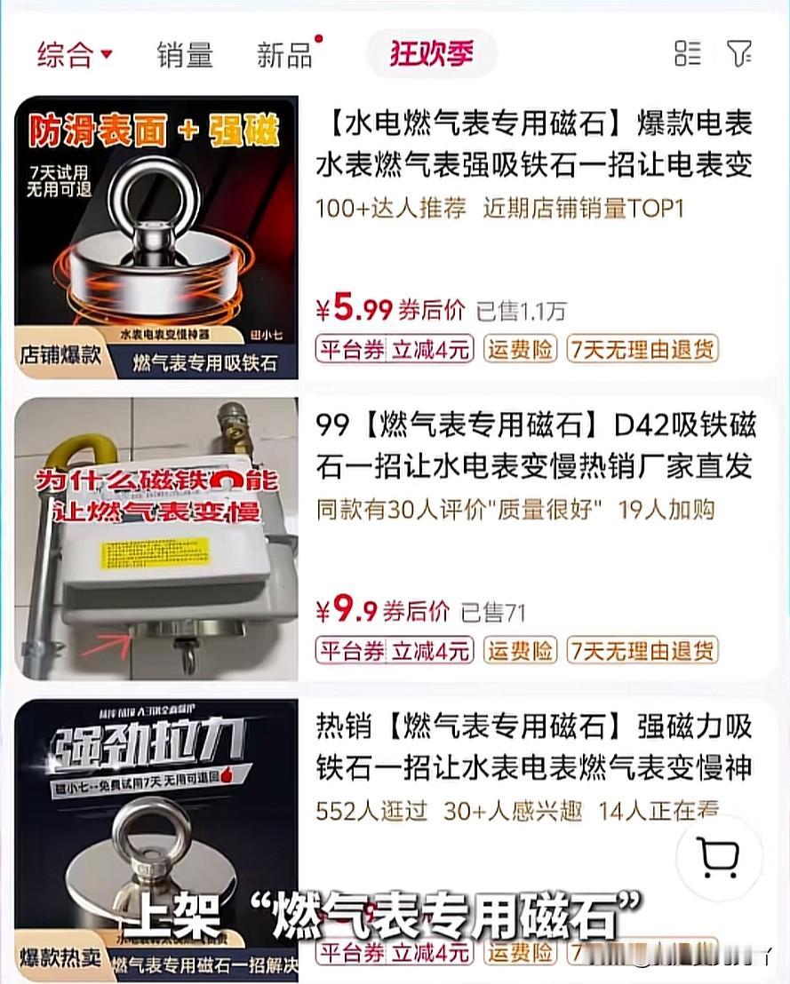 你家用燃气表换表后费用有没有增加?近日有网友发帖称一块磁铁就能让燃气表慢下来的小妙招并称实测有效,对此专家有话说 一块售价低至5.99的强磁铁就可以让家里的燃气表慢下来,近日有多人在社交平台分享这一生活小妙招。网购平台商家也上架燃气表专用磁石,价格在几块到十几块之间。最低的一家卖5.99元还包邮店铺单月销量已破万 专家表示燃气表经过多次更换已经更新换代,最新款燃气表自带电磁干扰设计磁铁是无法影响计数的,所谓的生活小妙招有造假嫌疑,呼吁大家切勿上当受骗 更重要的是窃气属于违法行为,一经查实会面临罚款甚至刑事处分