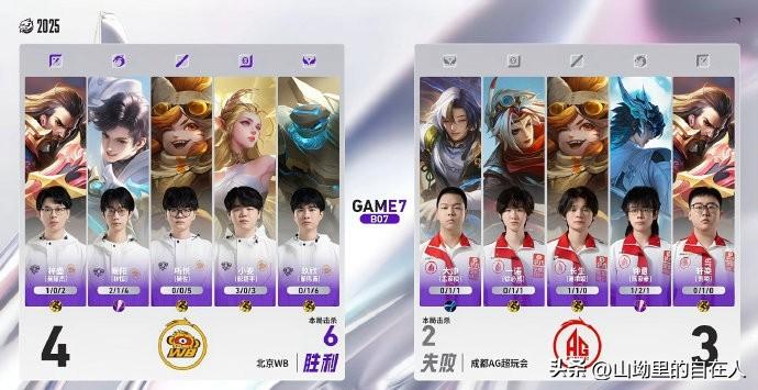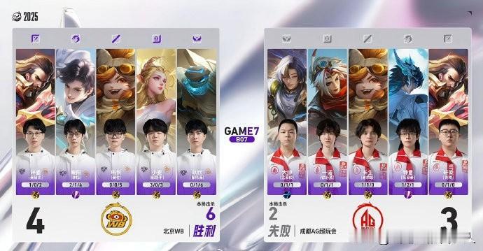12月19日挑战者杯双败淘汰赛首轮,成都AG超玩会3:4不敌北京WB,掉入败者组,掉入败者组**,同时终结了BO7赛事23连胜与长达469天的BO7不败纪录。 - 赛制:BO7全局BP+巅峰对决 - 进程:WB先3:1领先,AG连追两局进入巅峰对决,最终WB取胜 - 巅峰对决:AG曹操+大司命+沈梦溪+戈娅+空空儿;WB曹操+元流之子+沈梦溪+艾琳+盾山,WB凭借关键团战处理获胜 - 下一场:AG将于12月21日在败者组出战,再输即淘汰 - AG此前上一次输BO7是469天前(2024夏决3:4 KSG),上一次正式比赛失利也是对阵WB - 本场AG胜局MVP为长生与钟意 - WB晋级胜者组半决赛,后续对阵狼队