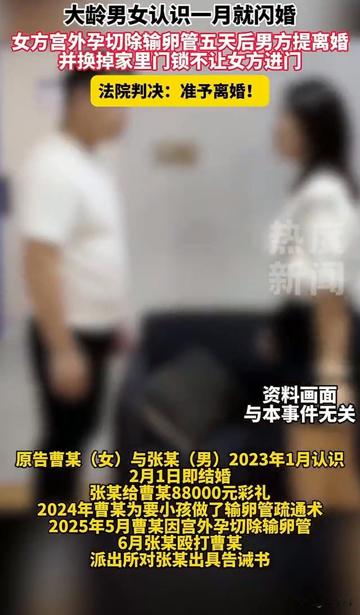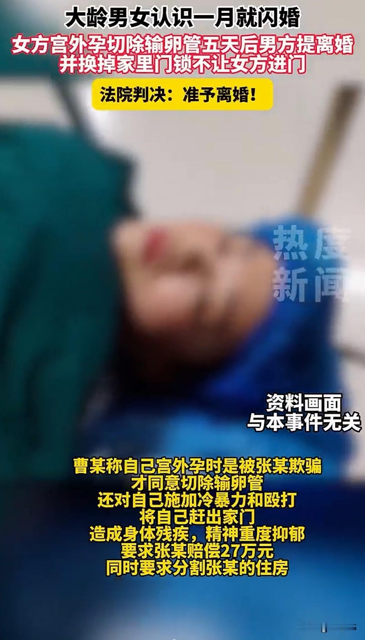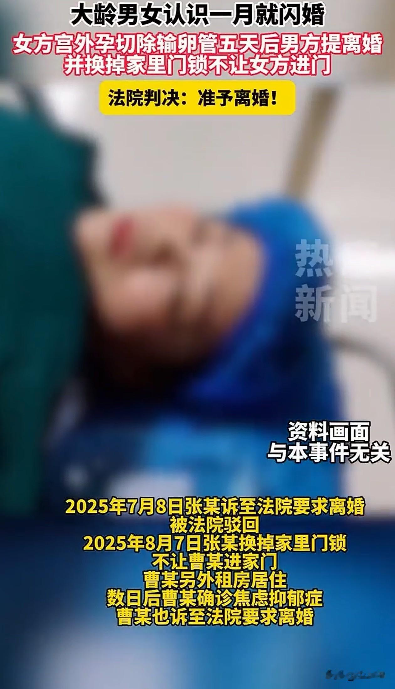 嫁错人了!四川西充,大龄男女相识1个多月立马闪婚,两年后女方宫外孕切了输卵管,男方立马翻脸不认人,火速提出离婚,还动手打人换门锁。法院:准予离婚! 曹某(女)和张某(男),2023年1月经人介绍认识,这刚过完年就火急火燎地把婚结了,从认识到领证,满打满算也就一个月,真真是“闪婚”。 婚后,俩人都想要孩子,所以曹某还特意去做了输卵管疏通手术,没想到最后宫外孕了,不得不切除了输卵管。 这手术才过去短短五天,丈夫张某不仅没好好照顾,反而向法院起诉要离婚,被法院驳回后,张某直接动手打人,最后干脆把家里的门锁给换了,直接把妻子曹某挡在了家门外面。 曹某没办法,只能自己租房子住。这一连串的打击下来,曹某被确诊患上了焦虑抑郁症。 后来,曹某自己也向法院起诉要求离婚,还要求张某赔偿27万元,并分割张某的住房。 最后法院经过审理,酌情判决张某向曹某支付经济补偿款34600元,并准予两人离婚。 @尘字书 阿书觉得男方的做法确实太不地道,甚至有点狠心。媳妇刚做完手术,身体正虚着,最需要人照顾的时候,他非但没点温情,反而急着离婚、动手打人、换锁赶人,这一套“组合拳”下来,搁谁身上都得抑郁。 不管怎么说,“闪婚”就跟赶集抢购似的,看着差不多就成交,风险实在太大了。俩人认识一个月能了解多深?恐怕连对方啥脾气都没摸透。这哪是过日子,简直是过家家。 结婚不是终点,而是漫长相处的起点。如果基础不牢,一旦遇到风雨,很容易就像这样瞬间垮掉,留给双方的都是难以愈合的伤。 与其匆忙开始,不如慎重选择,找个能并肩扛事的人,否则真是赌不起。 说到底,婚姻这事儿,真不能光图快!