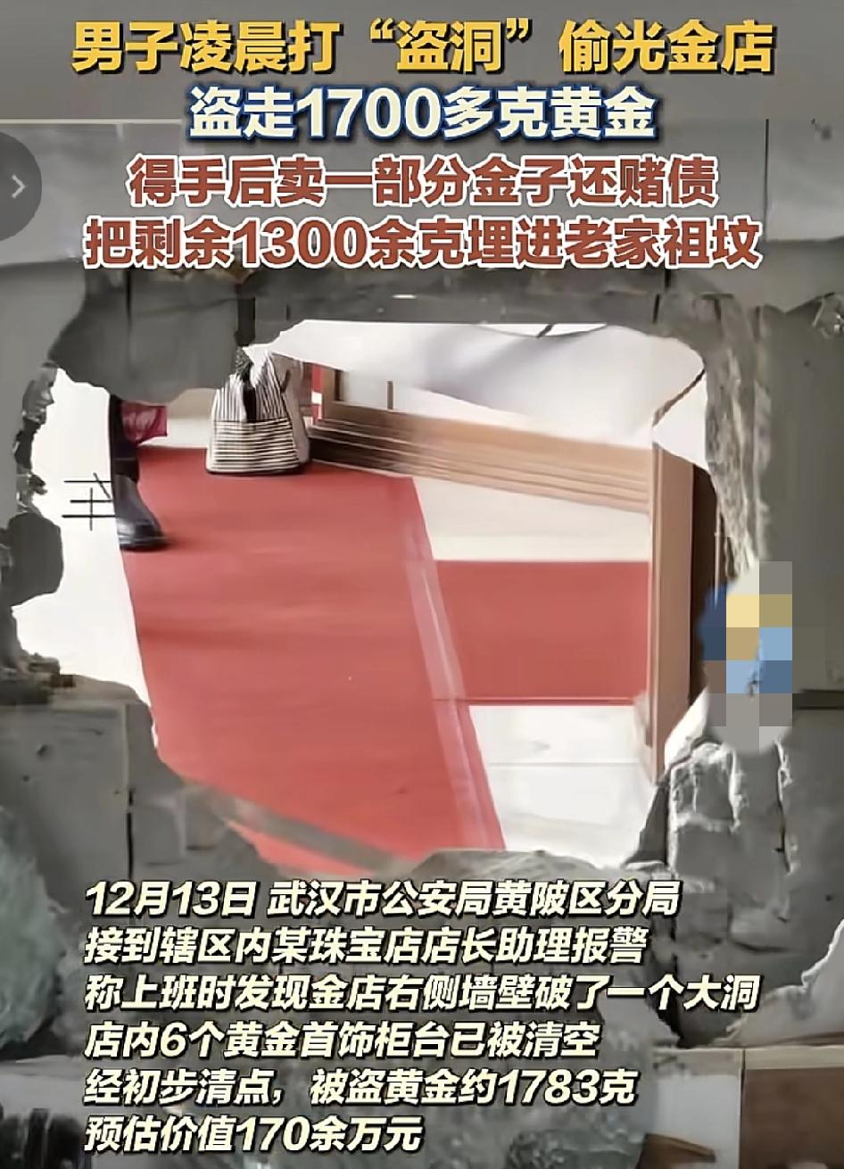 武汉一家黄金店员工上班时发现店内侧壁破了一个大洞,随后发现店内有将近1783克的黄金不见了,价值170多万。员工报警之后,由于店内的监控被破坏,店内监控无法查看,不过从周边的监控可以显示一名男子凌晨在黄金店的隔壁的手机店里待了许久,经过排查,锁定犯罪嫌疑人,犯罪嫌疑人先是把400多克的黄金用卖出去用于抵债,再剩把剩下的黄金埋于老家随州的祖坟后面,嫌疑人原本打算就把所有的赃物销出去之后,在逃往境外,但是没想到自己被抓的那么快。