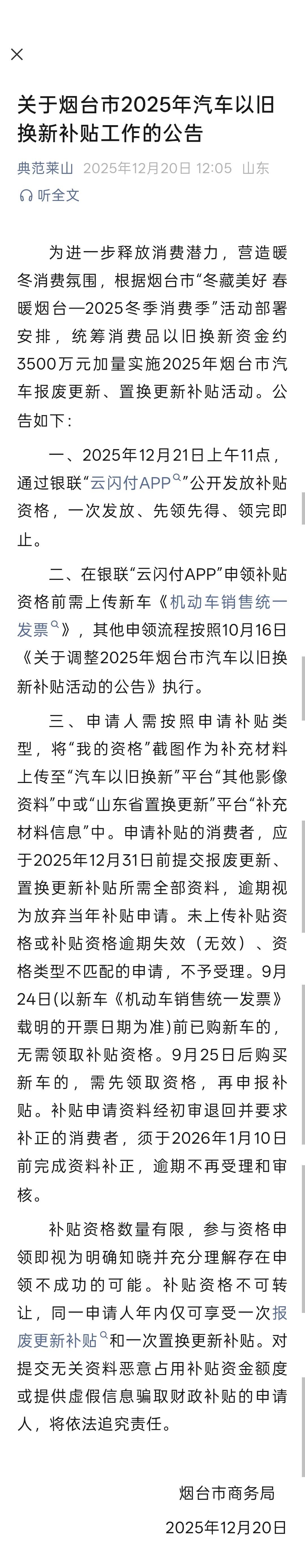 关于烟台市2025年汽车以旧换新补贴工作的公告