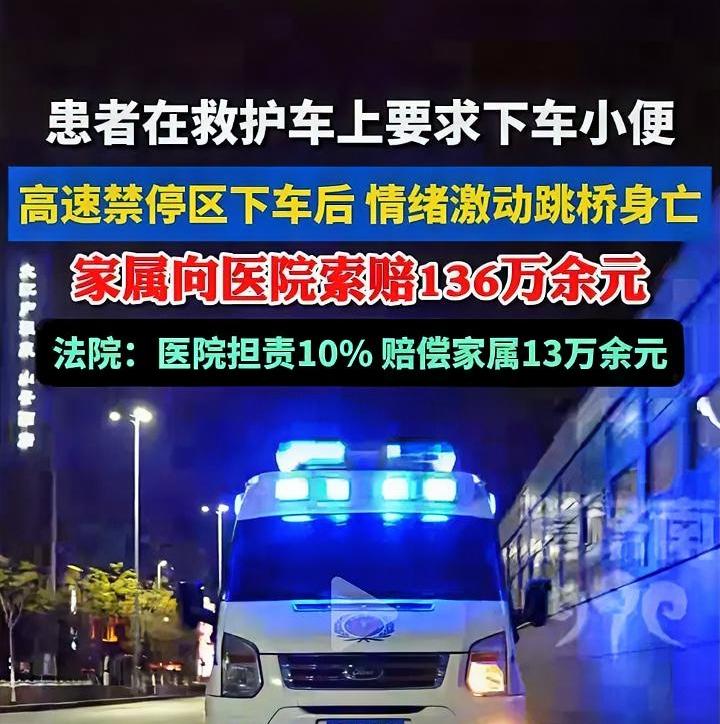这算不算讹人? 救护车停也不对,不停也不对。病人情绪激动要上厕所,不停怎么办?高速路多危险,万一激动之下砸车,一车人都有危险。 结果停了可倒好,病人跳桥轻生了,救护车懵了,本来是为了救人,结果把人“救”没了。 按理说病人是自杀的,能怪得了谁?结果因为救护车高速违停,赔了13万,这次真替救护车喊冤了。
