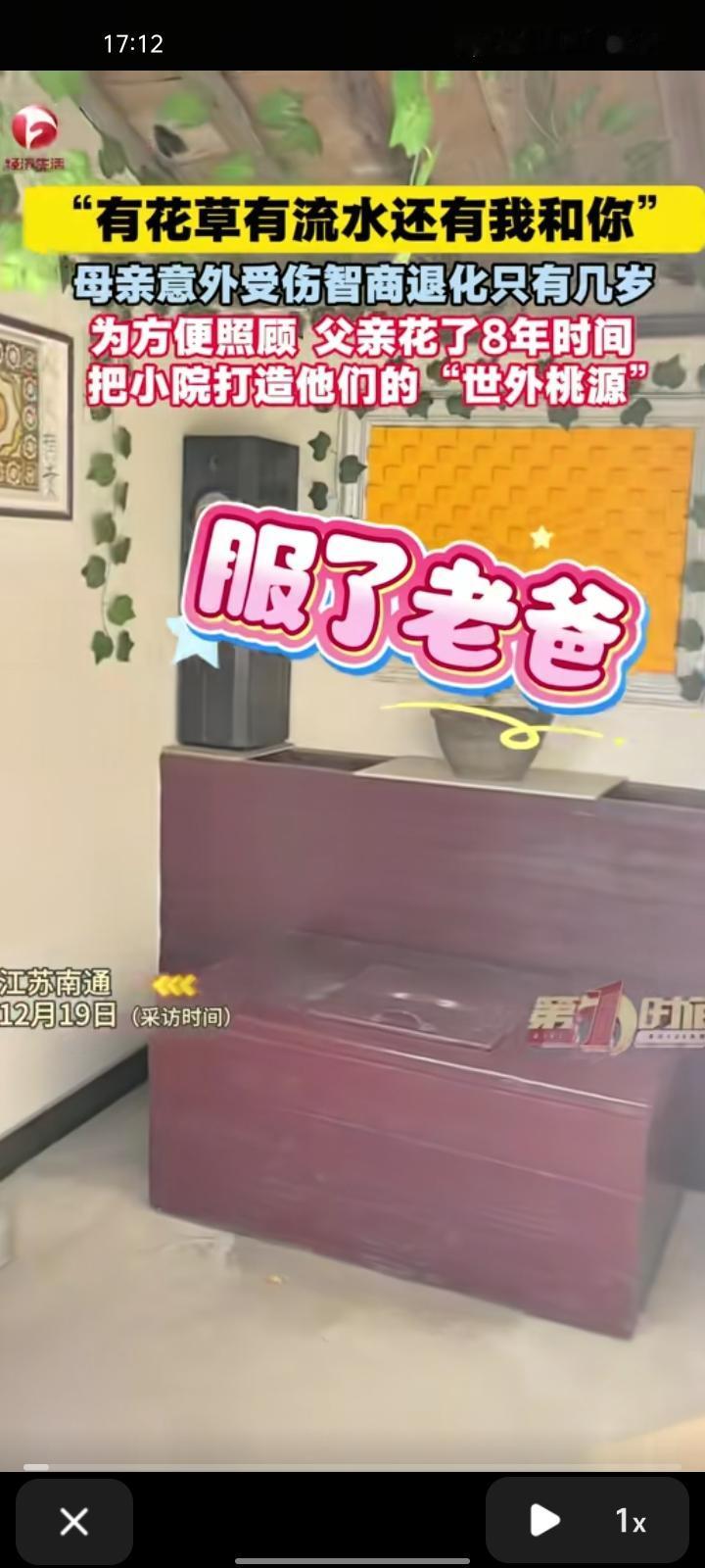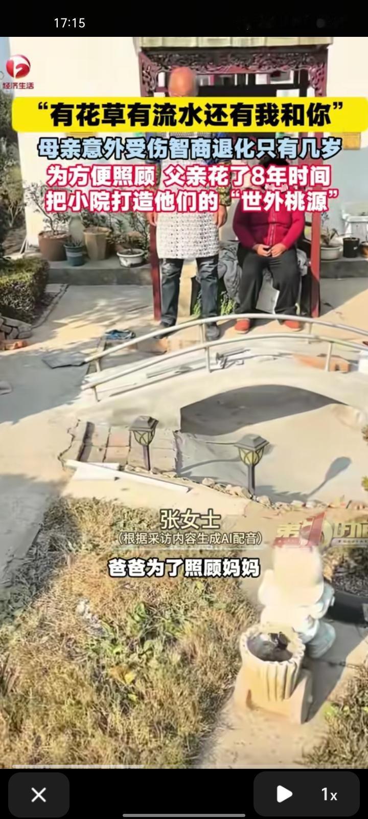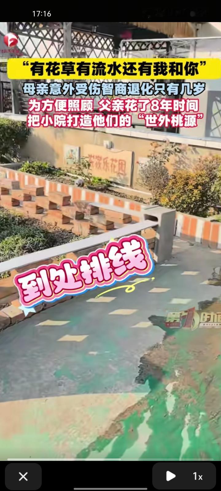12月18日,江苏南通。女子分享一段视频,父亲把厕所搞成庭院,还以为是准备要住人,庭院外有花花草草,还有一座桥。母亲八年前被电车撞了,生活无法自理,智商退化到只有几岁。父亲为了照顾母亲,怕她瞎跑就把院子建成属于两人的世外桃源。 2023年4月,海门电视台的记者来采访父亲的小花园,可以看出,父亲的奇思妙想有些特别。