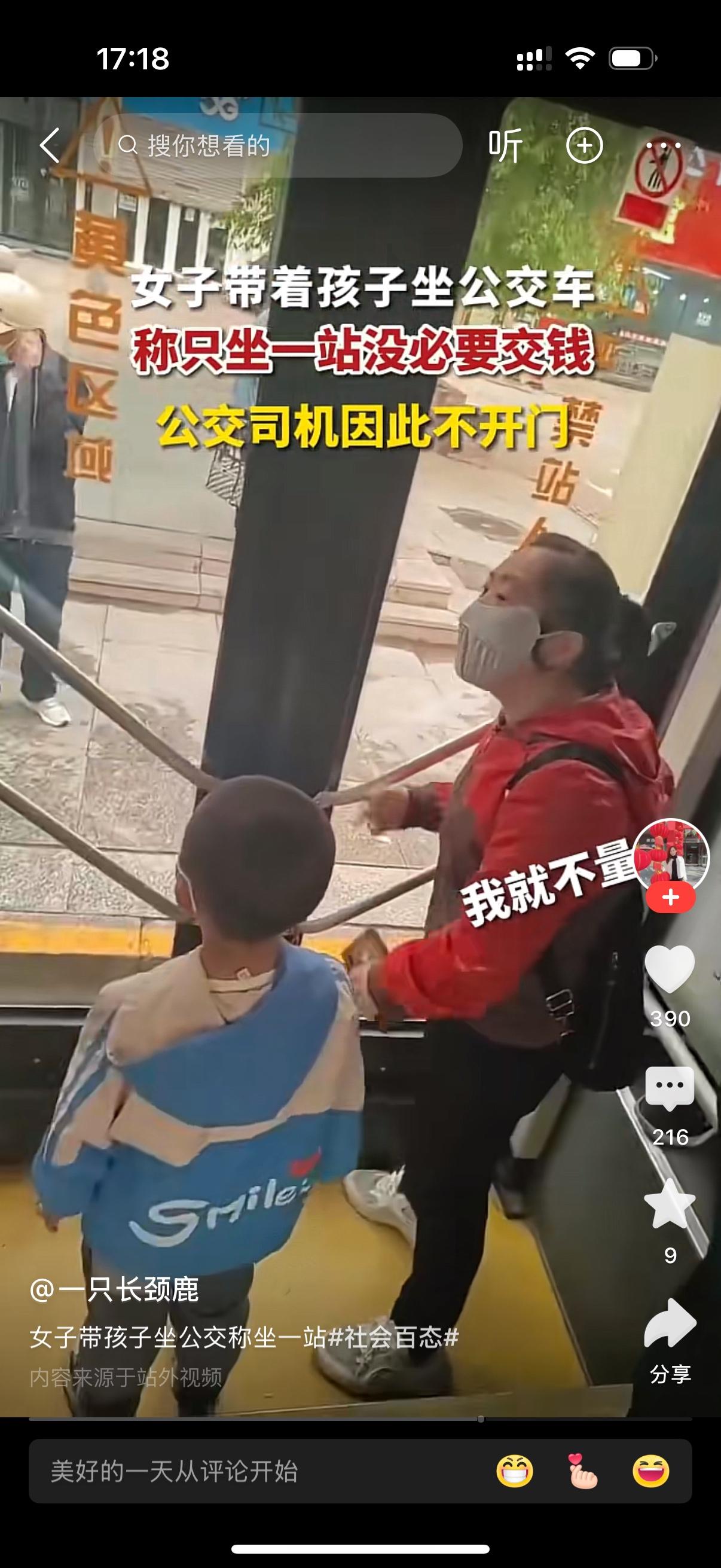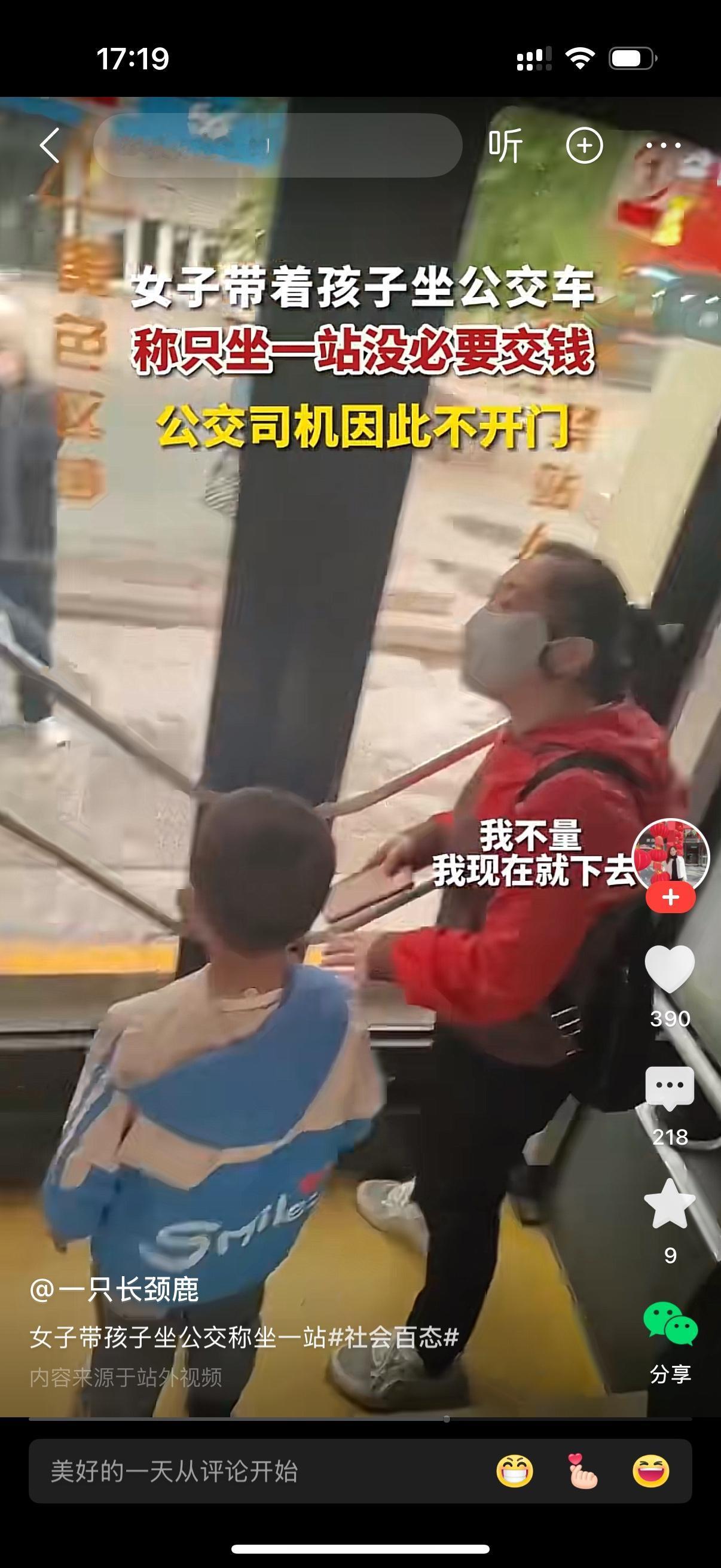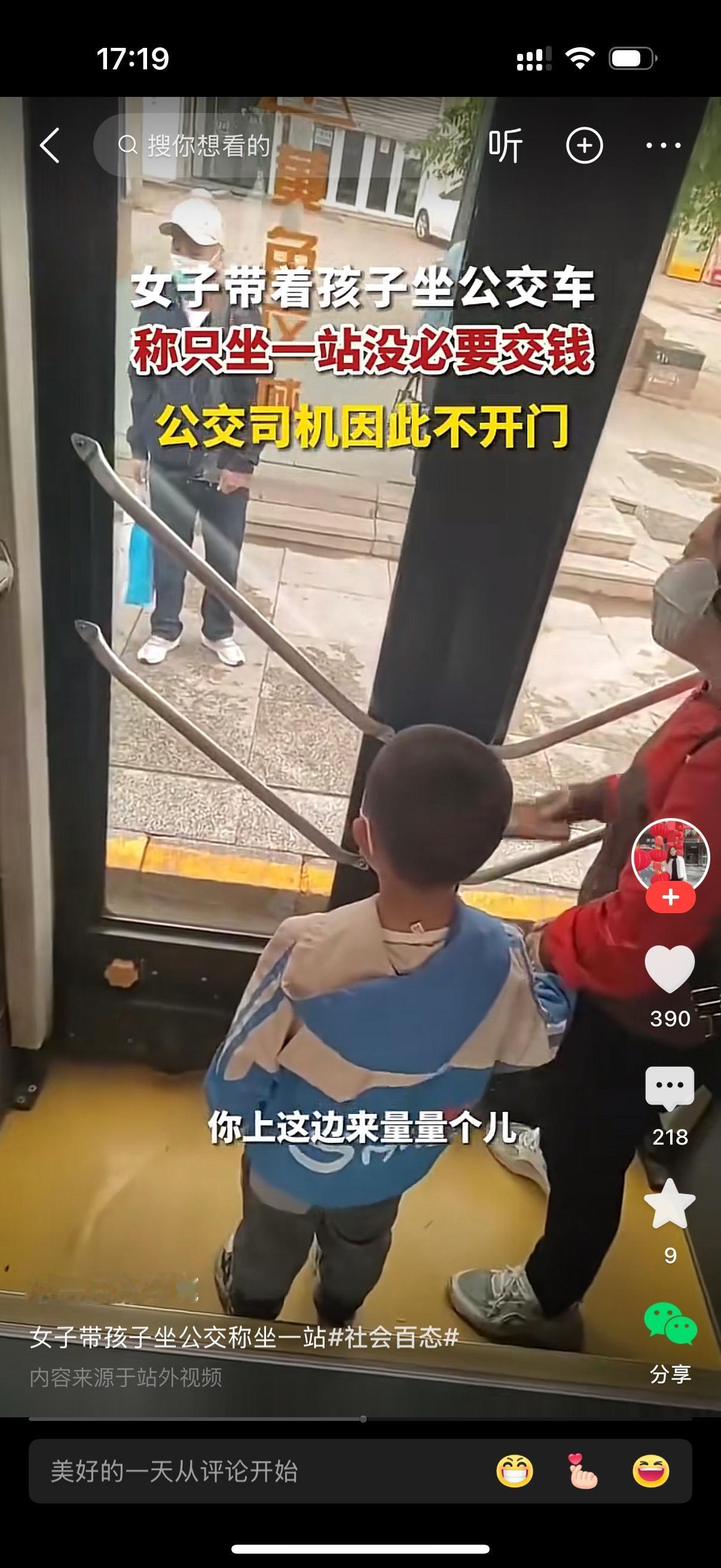 女人带小孩坐公交,称只坐一站路不愿意掏钱。公交车司机不开门。其他乘客让小孩去量一下个儿,女子叫嚣我就不量。司机就一直不开车门,就这样僵持着。乘客们劝女人给孩子做个好榜样,投个币就可以下车了。女子却坚持不肯,看来这一块钱对她真的很重要。人穷可以,但还是要讲道理。你穷不是耍横的理由。