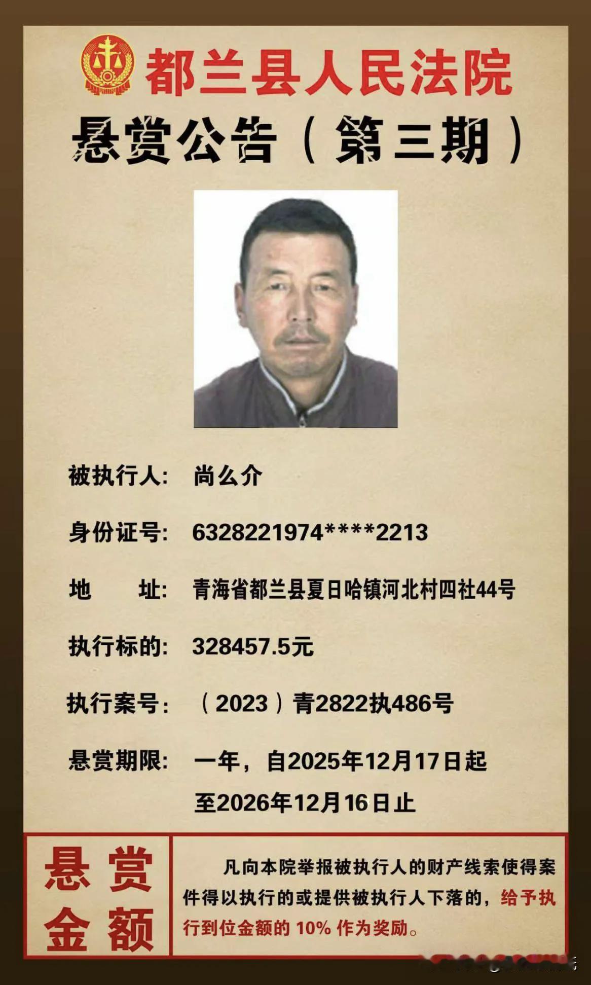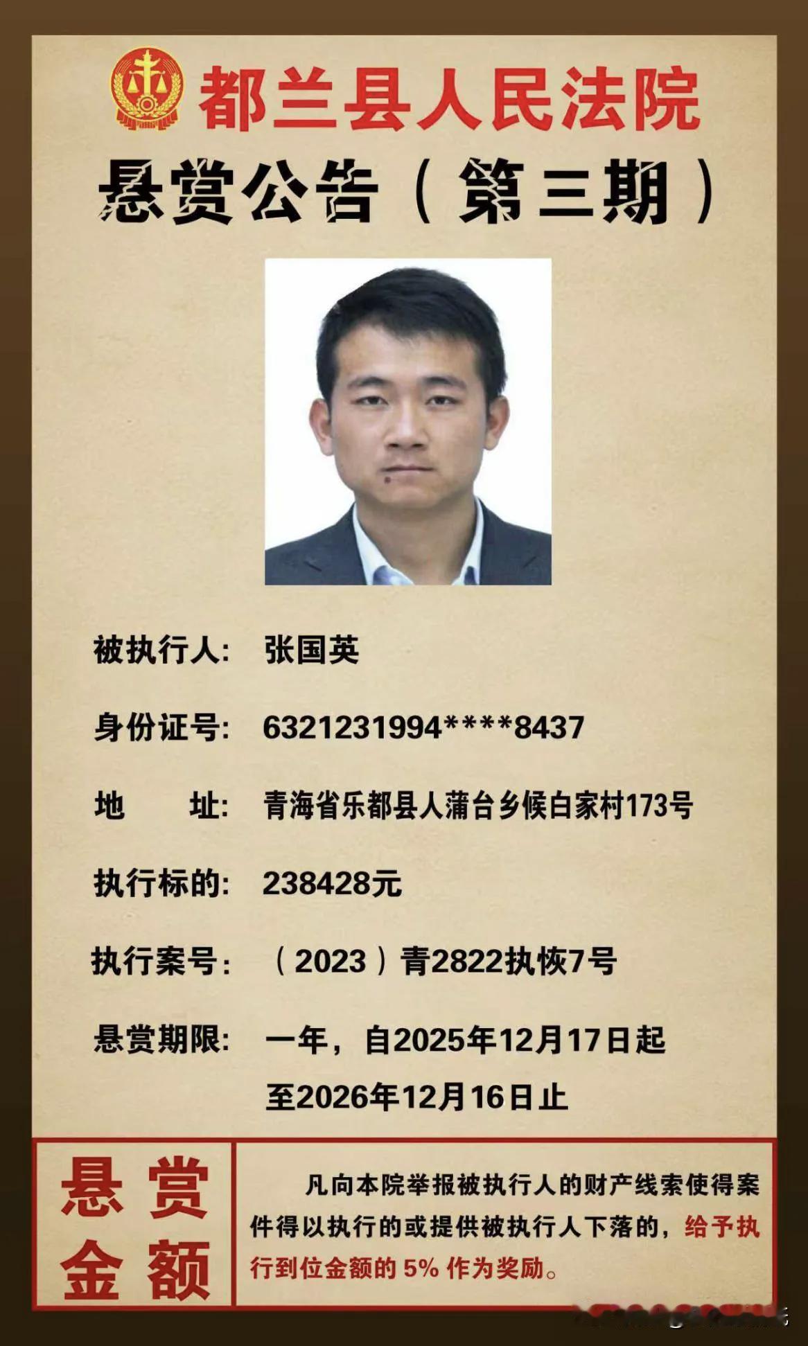 全网悬赏!青海这两人谁认识?欠钱不还,还玩失踪! 张国英、尚么介,名字记好了!你俩欠款分别超过23万和32万,法院正式全网悬赏找人找财产! 凡提供有效财产线索或藏身之处的,最高奖执行款的10%!算算,这可是好几万的“线索费”。身边有知情的老乡、朋友,这不仅是帮忙,更是机会。 也奉劝二位:躲得过初一,躲不过十五。大数据时代,能躲哪儿去?主动现身还钱,堂堂正正做人,才是正道。当“老赖”寸步难行,别等法律铁拳砸到头上才后悔! 转发扩散,让诚信归位! 执行悬赏公告